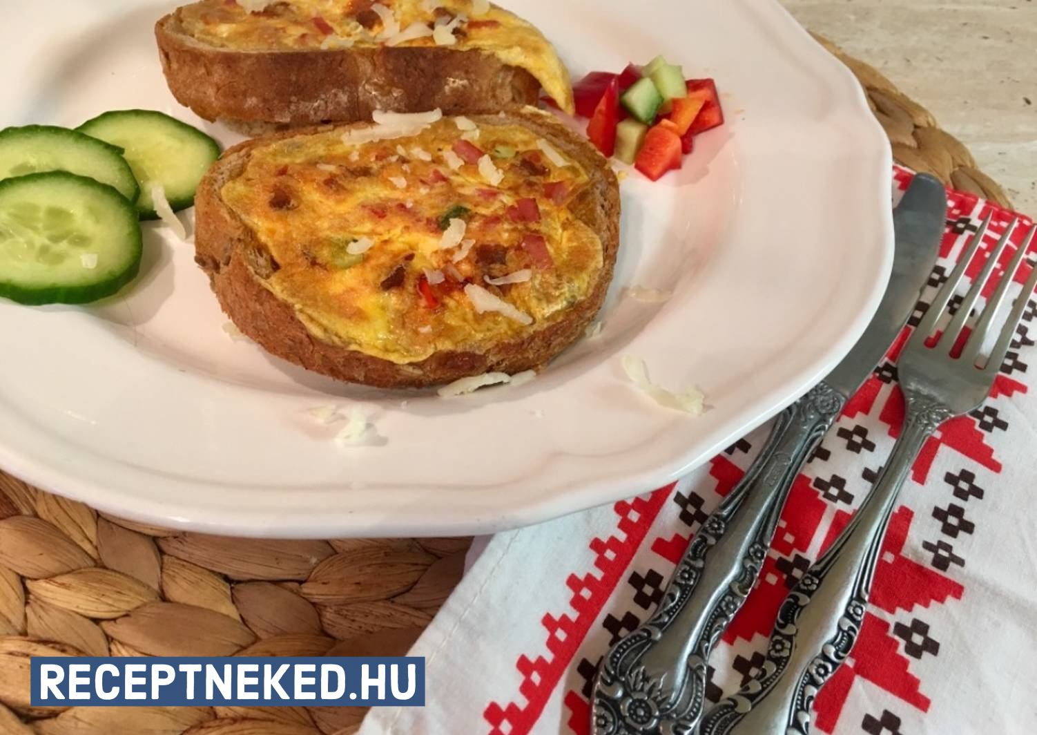 Ha a felvágott kicsit átmelegedett beleöntjük a résekbe a sajttal elkevert tojást és addig sütjük, amíg egy kis lapáttal alá nem tudunk nyúlni. Ekkor mehet rá a kenyerek belseje.