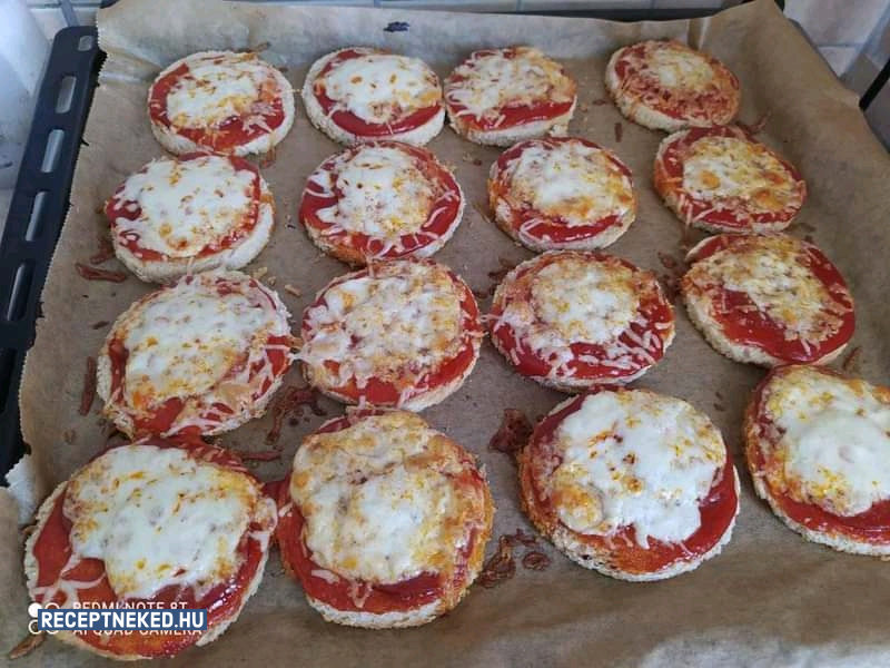 A kiszaggatott tésztát egyesével megkenem paradicsomszósszal, megszórom oregánóval, ráteszek egy szelet szalámit és egy csipet sajtot.