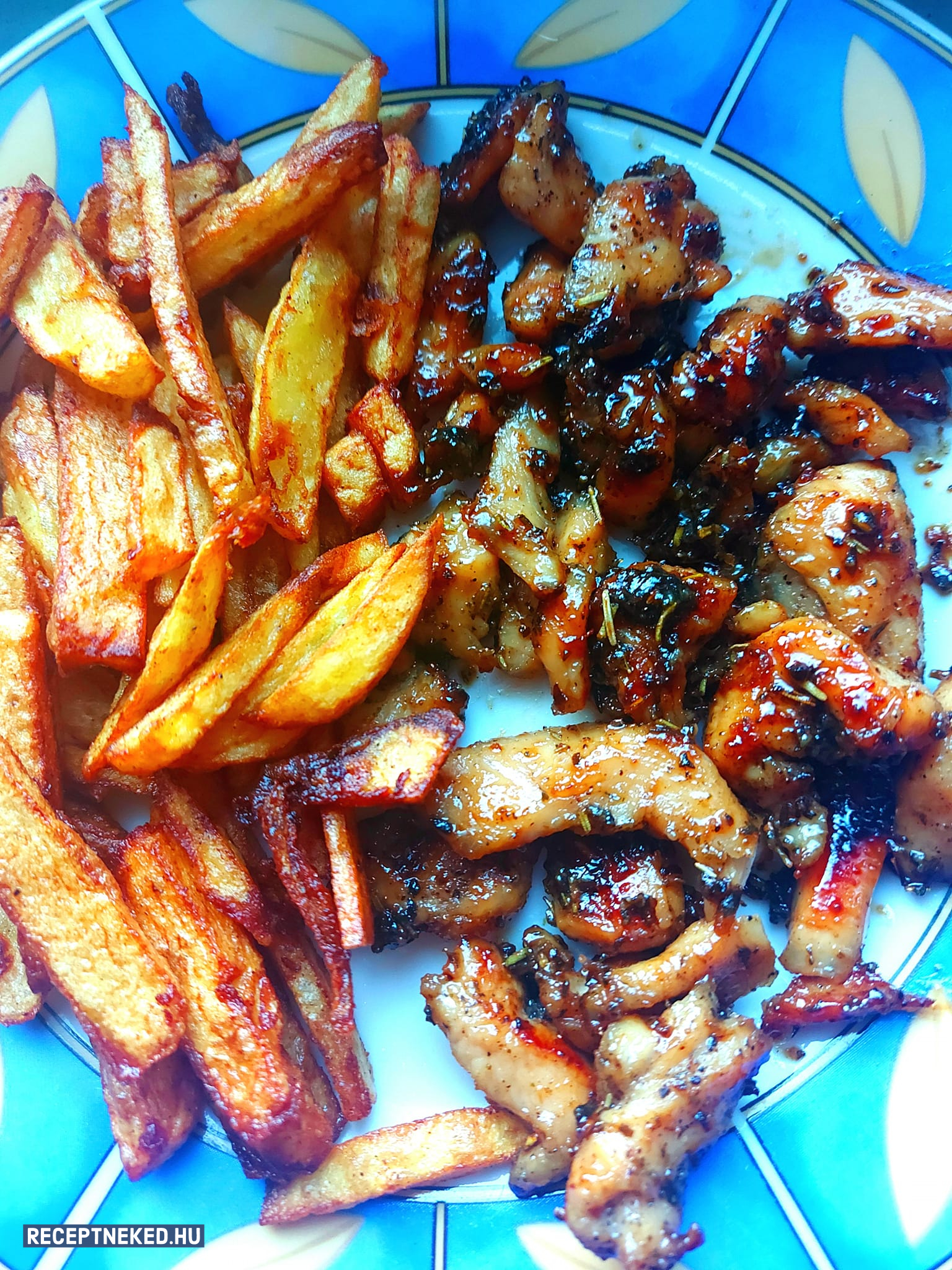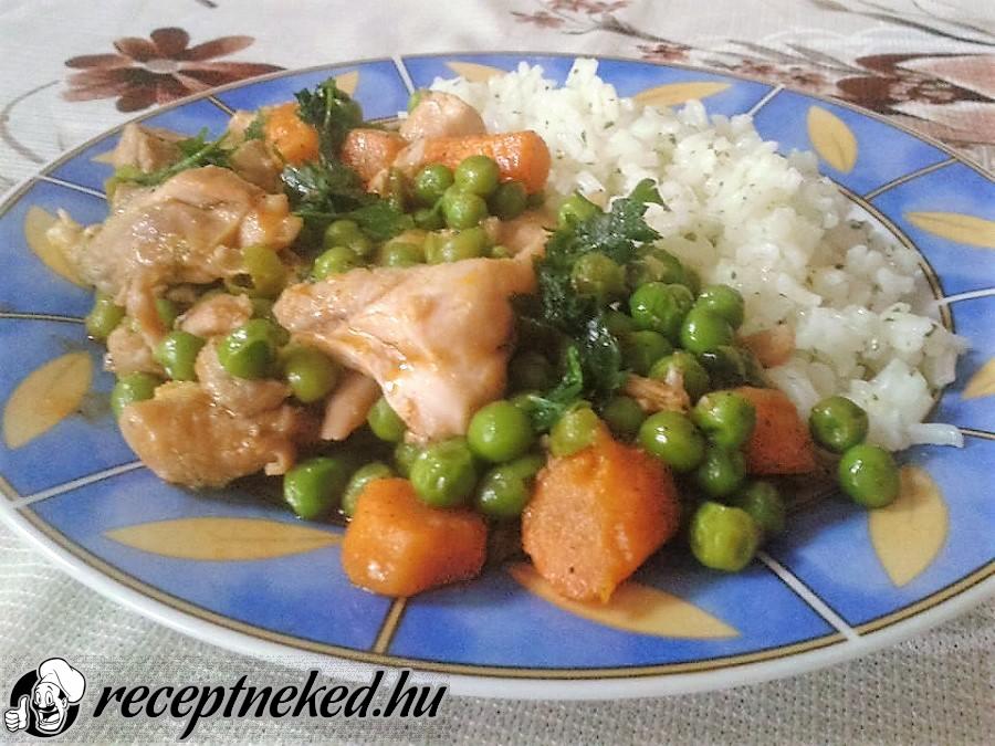 Minimum fél órát pácoljuk, majd forró olajon megpirítjuk. Ezután hozzáöntjük a zöldséget és tovább főzzük. Ha szügséges felöntjük egy pici vízzel és utánízesítjük.
