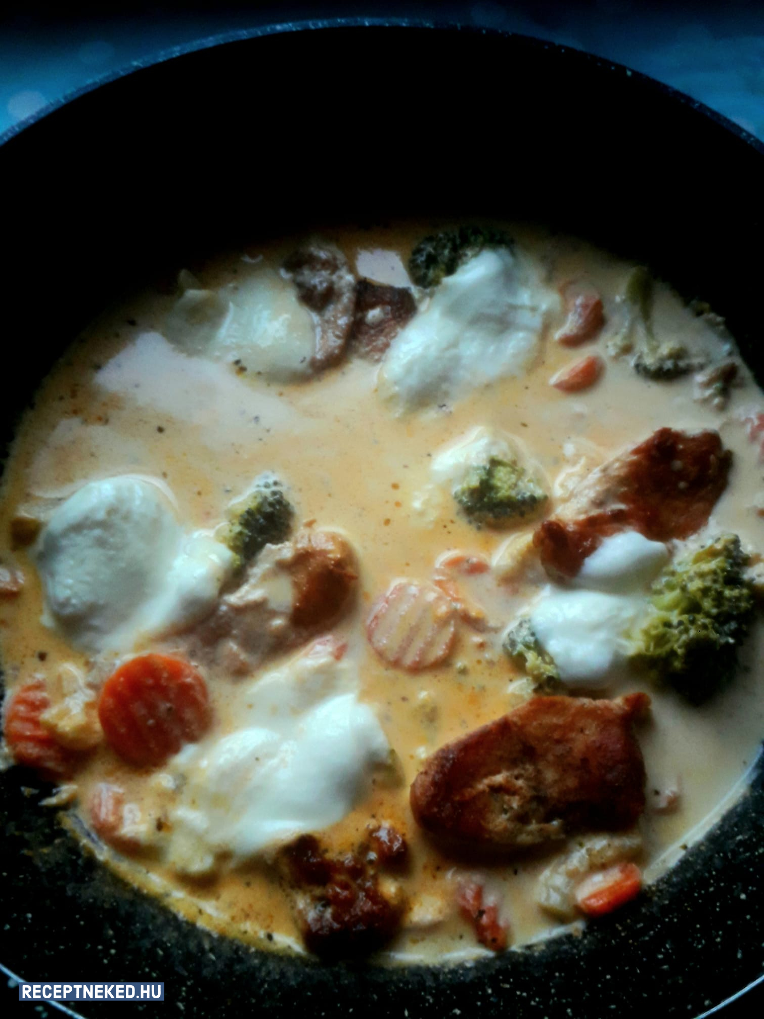 Ha már a zöldség is puha egy kis tejföllel sűrítjük, majd még egyszer felforraljuk.