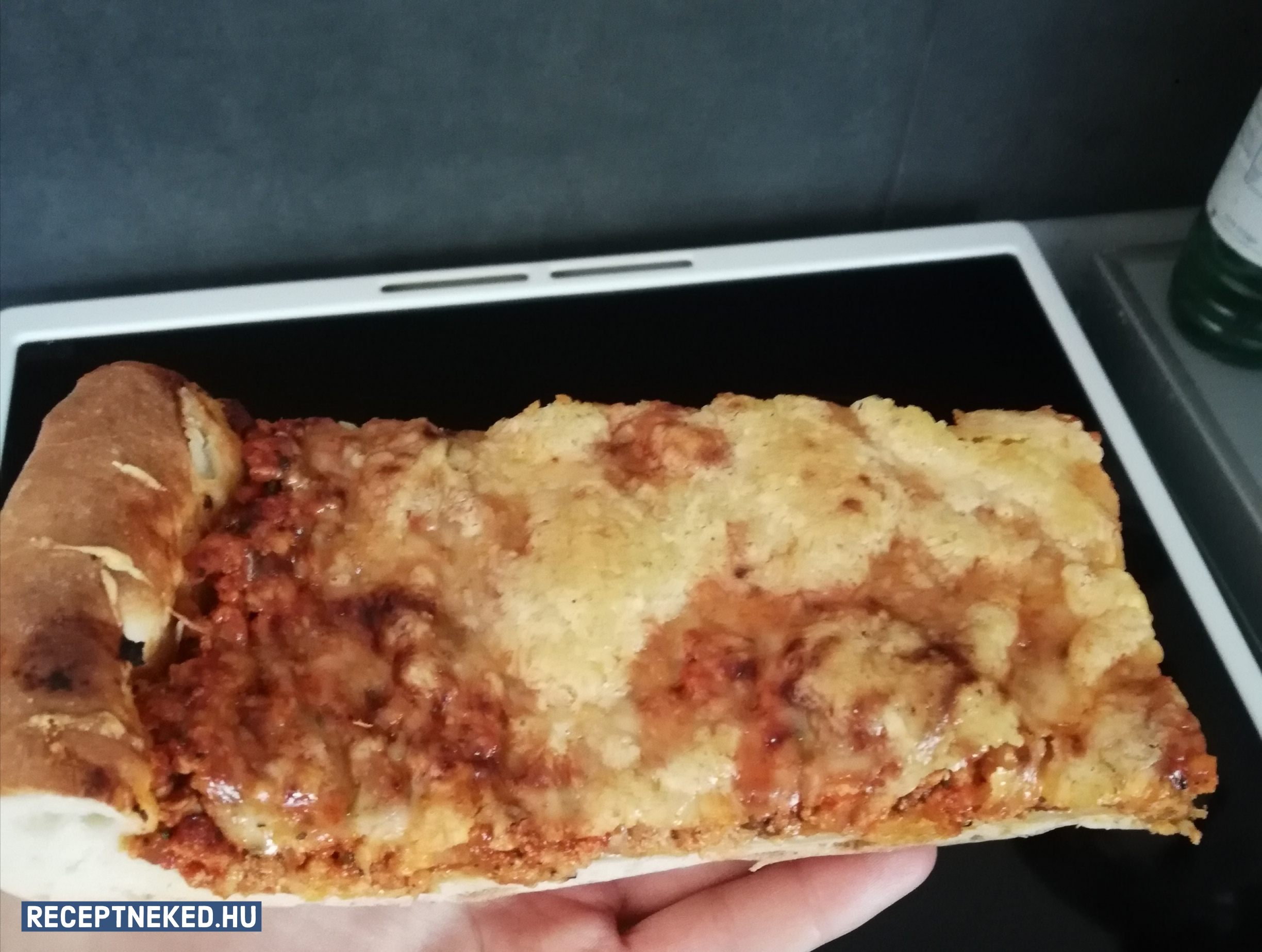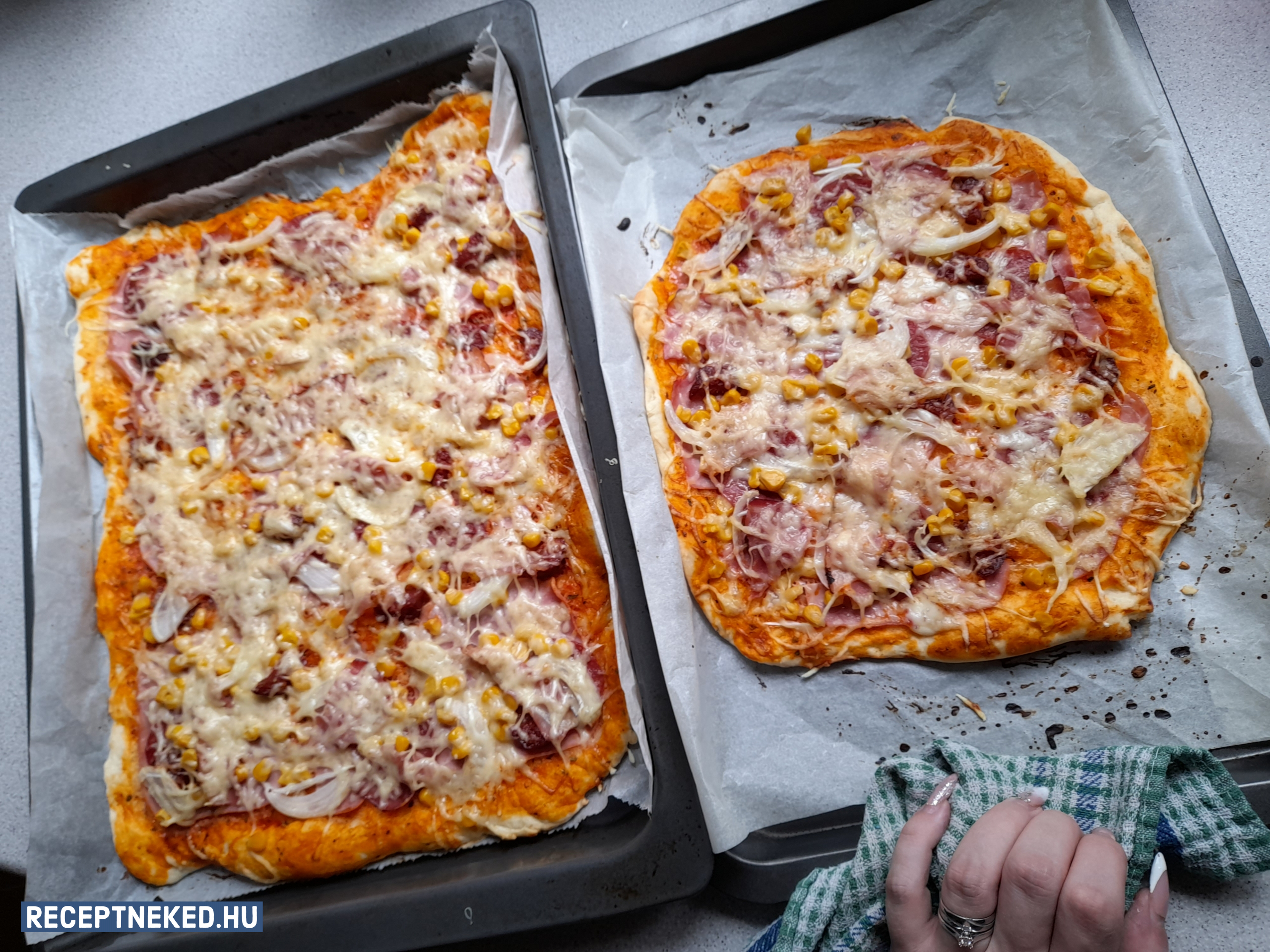 Ha vastagabb pizzát szeretnénk, akkor a teljes tésztamennyiséget kell beletenni a hagyományos nagy sütőtepsibe, ha vékonyabbat, akkor elég a tészta fele, simán szét lehet úgy nyújtani, hogy kitöltse a tepsit. Ha marad még tésztánk, akkor természetesen egy másik tepsibe nyújthatjuk és máris nagyobb mennyiség keletkezik. Nálunk ez úgy működik, hogy a párom a vékonyabbat szereti, neki a nagy tepsiben készítem, én viszont vastagabban, így magamnak egy kisebb tepsit használok, amibe a mardék tésztából készítek tésztalapot.