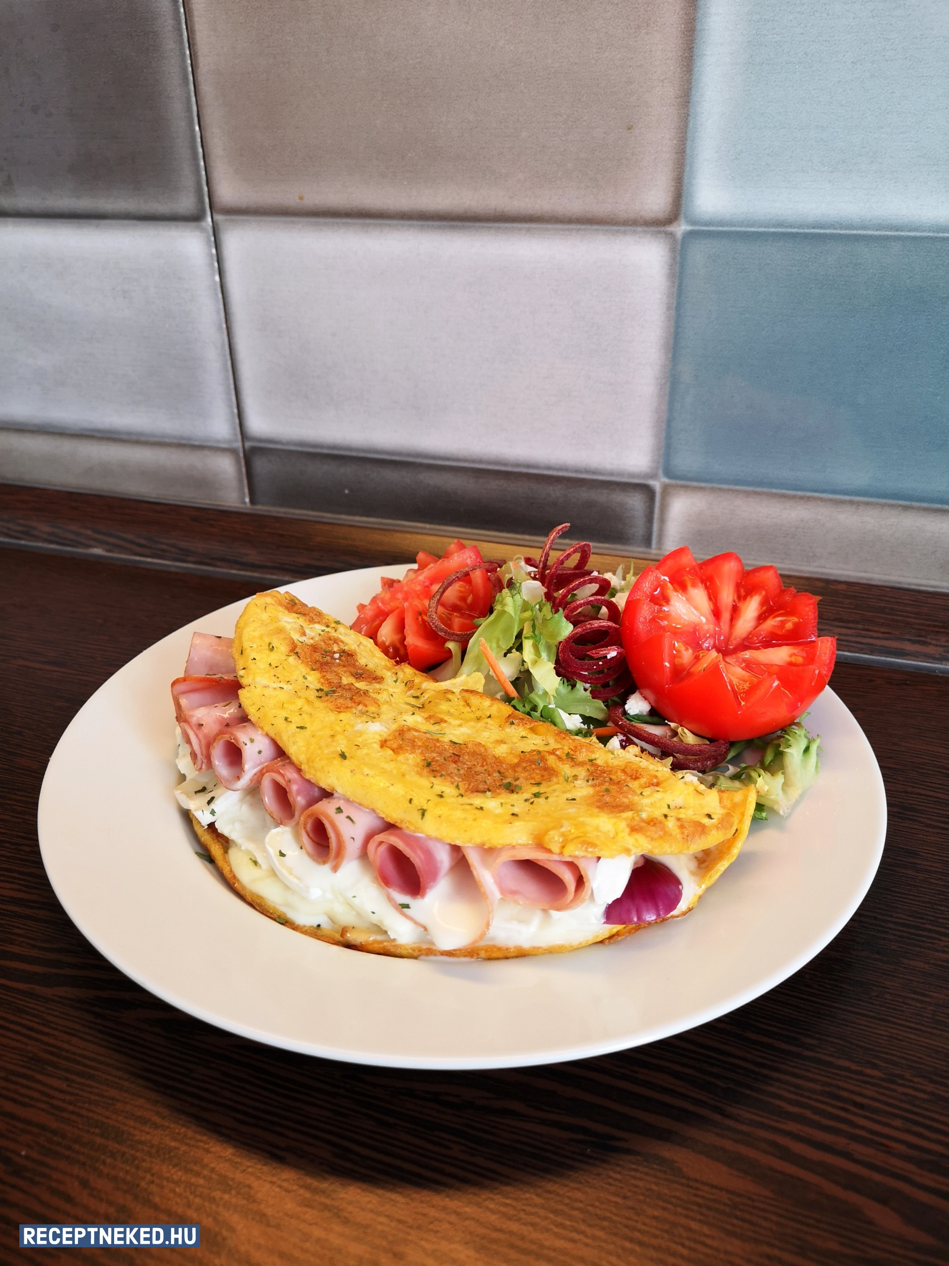 A serpenyőben zsírt hevítek, erre teszem a hagymát. Pár másodpercig dinsztelem és hozzáöntöm a felvert tojást (nem keverem). Ha látom, hogy az alja kezd megsülni, hozzáadom a sajtokat és megszórom a zellerlevéllel.