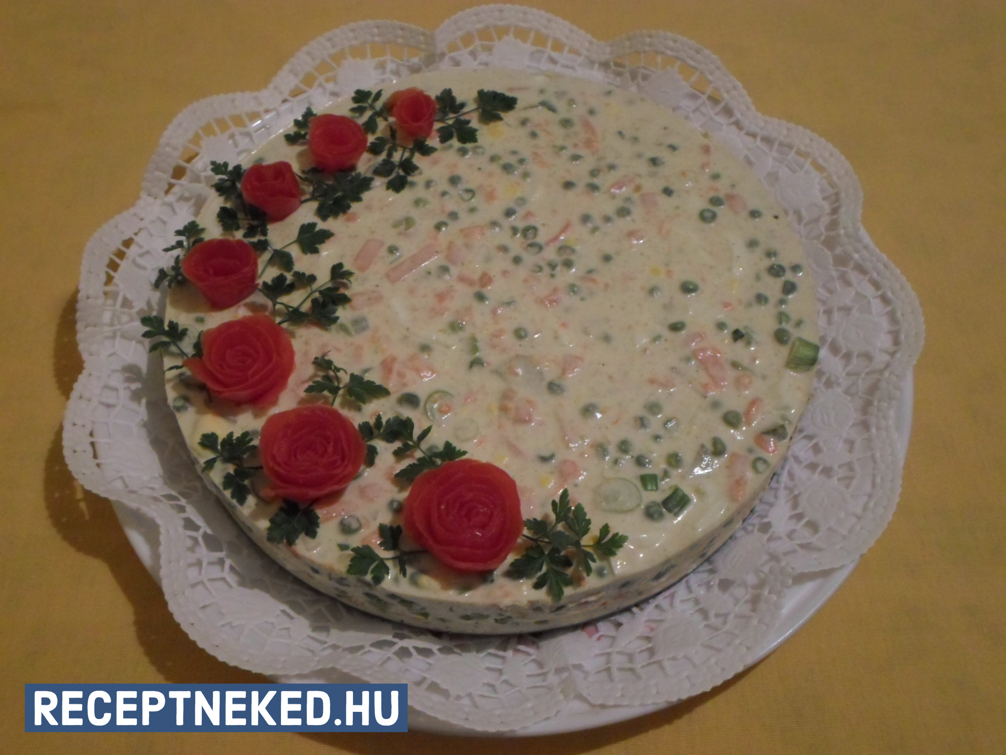 A tojáskrémet visszatöltjük a tojásfehérjék üregébe és a töltött felükkel lefelé a franciasalátára rakosgatjuk őket, majd a maradék 1/3-ad tartármártást vékony sugárban rájuk csorgatjuk, úgy, hogy mindenütt befedje.