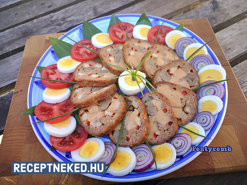 A maradék krémet habzsákba tesszük, a sonkatekercs végeit és tetejét megdíszítjük vele,petrezselyemzölddel is díszítjük.