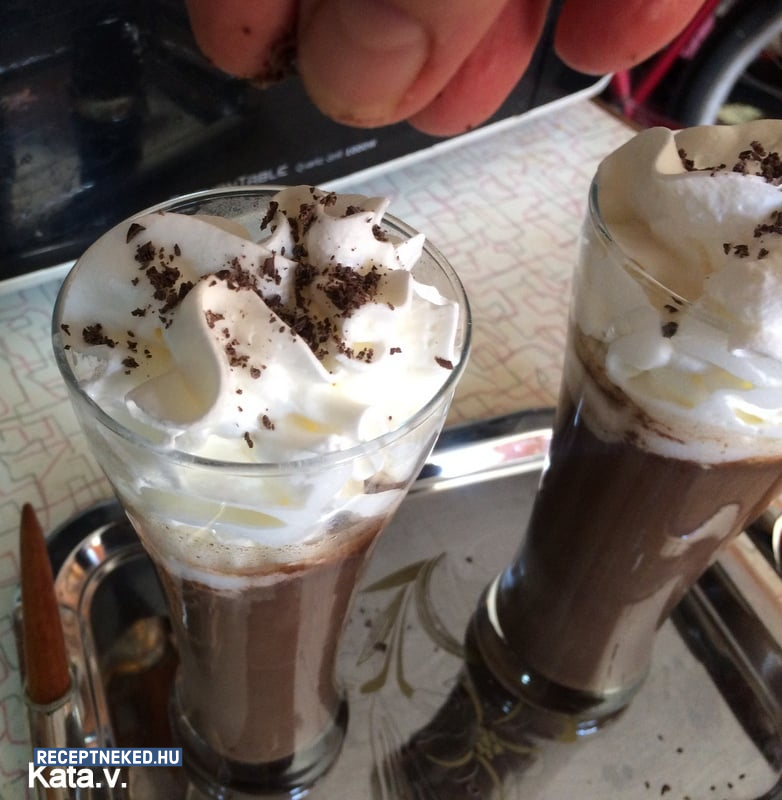 Ezután bögrébe töltjük, a tetejére tejszínhabot nyomunk, megszórjuk reszelt csokoládéval, pillecukorral és vattacukrot teszünk még rá.