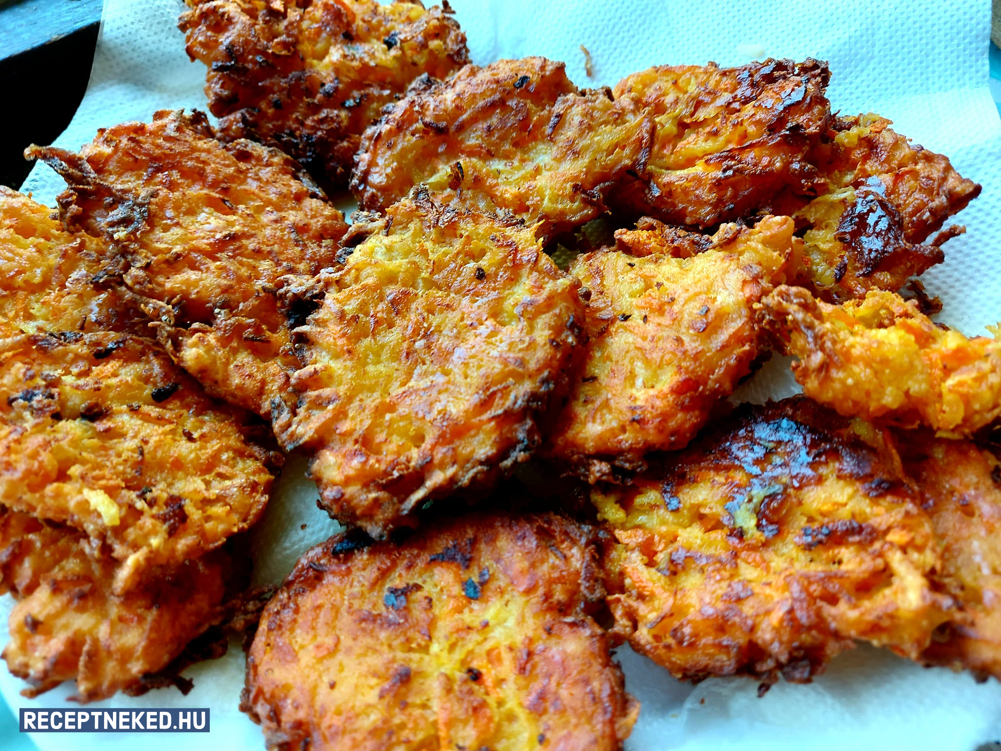 A krumplit és a hagymát megtisztítjuk és nagy lyukú sajtreszelőn lereszeljük. Megsózzuk, megborsozzuk, hozzáadjuk a tojást, a lisztet és a petrezselymet.