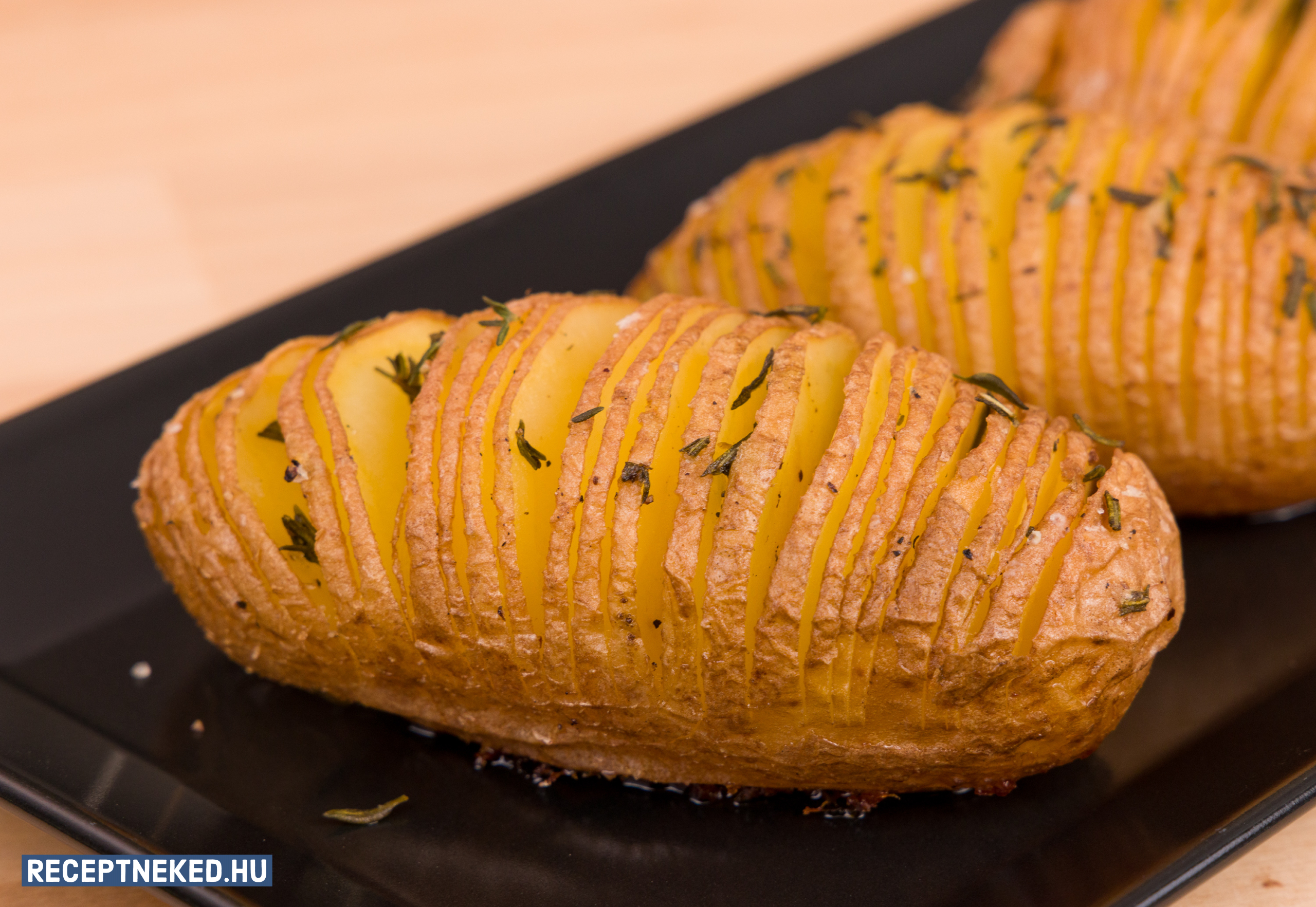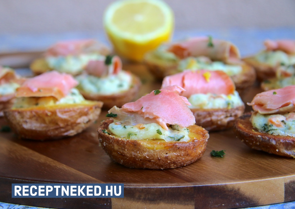 A megtöltött burgonyákat tekerjük körbe bacon szeletekkel és sorakoztassuk tepsibe.