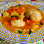 A zöldségeket visszatesszük a levesbe, tálaláskor teszünk minden tányérba a párolt karfiolból, rámerjük a levest majd felaprított újhagymával és kockára vágott kápia paprikával kínáljuk.