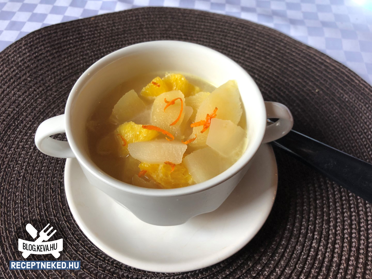 Ezután a tejfölből, pudingporból, valamint a levesből kimert kevés lével habarást készítünk. Csomómentesre keverjük, majd folyamatos keverés mellett a leveshez adjuk, forraljunk rajta egyet és kész is.