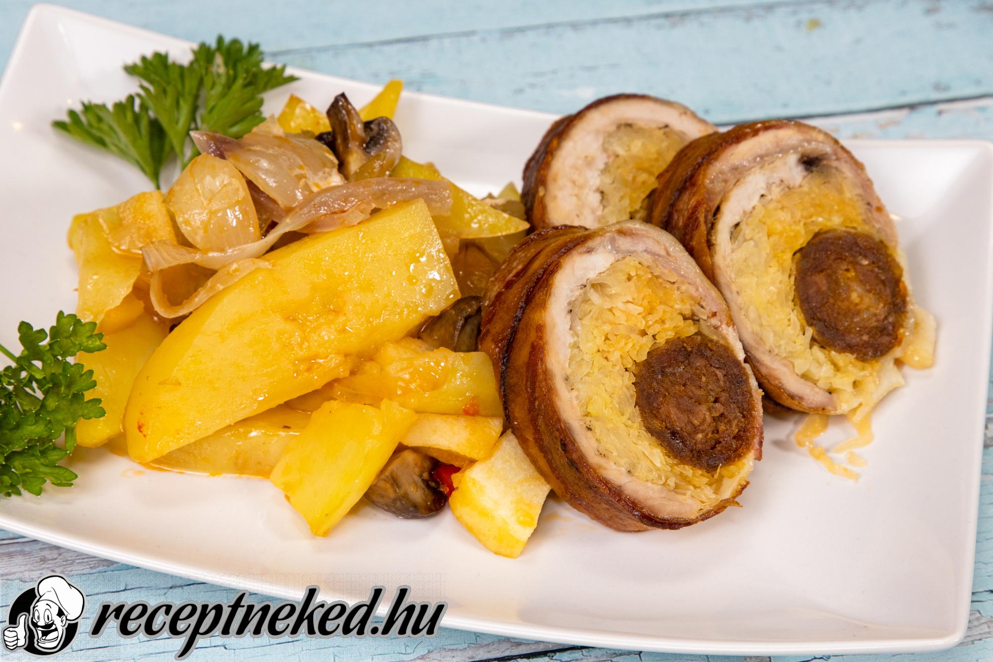 A káposztát hideg vízben átmossuk, kicsavarjuk és kb 2,5 liter vízben feltesszük főni. A kolbászt és a tarját apró kockára vágjuk.