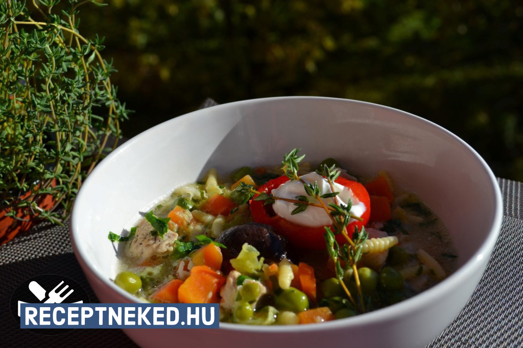 Egy fazékban kevés kókuszzsíron vagy olajon a zöldségeket pároljuk meg, engedjük fel vízzel. Kezdjük alacsony lángon főzni és fűszerezzük be az alábbiakkal: ízlés szerinti sóval, borssal, egy bő teáskanál tárkonnyal, fél teáskanál kakukkfűvel, fél teáskanál turbolyával, fél teáskanál borsikafűvel, negyed teáskanál szárított lestyánnal, 1 mokkáskanálnyi kurkumával, egy kevés frissen reszelt szerecsendióval és egy csipet rozmaringgal.
