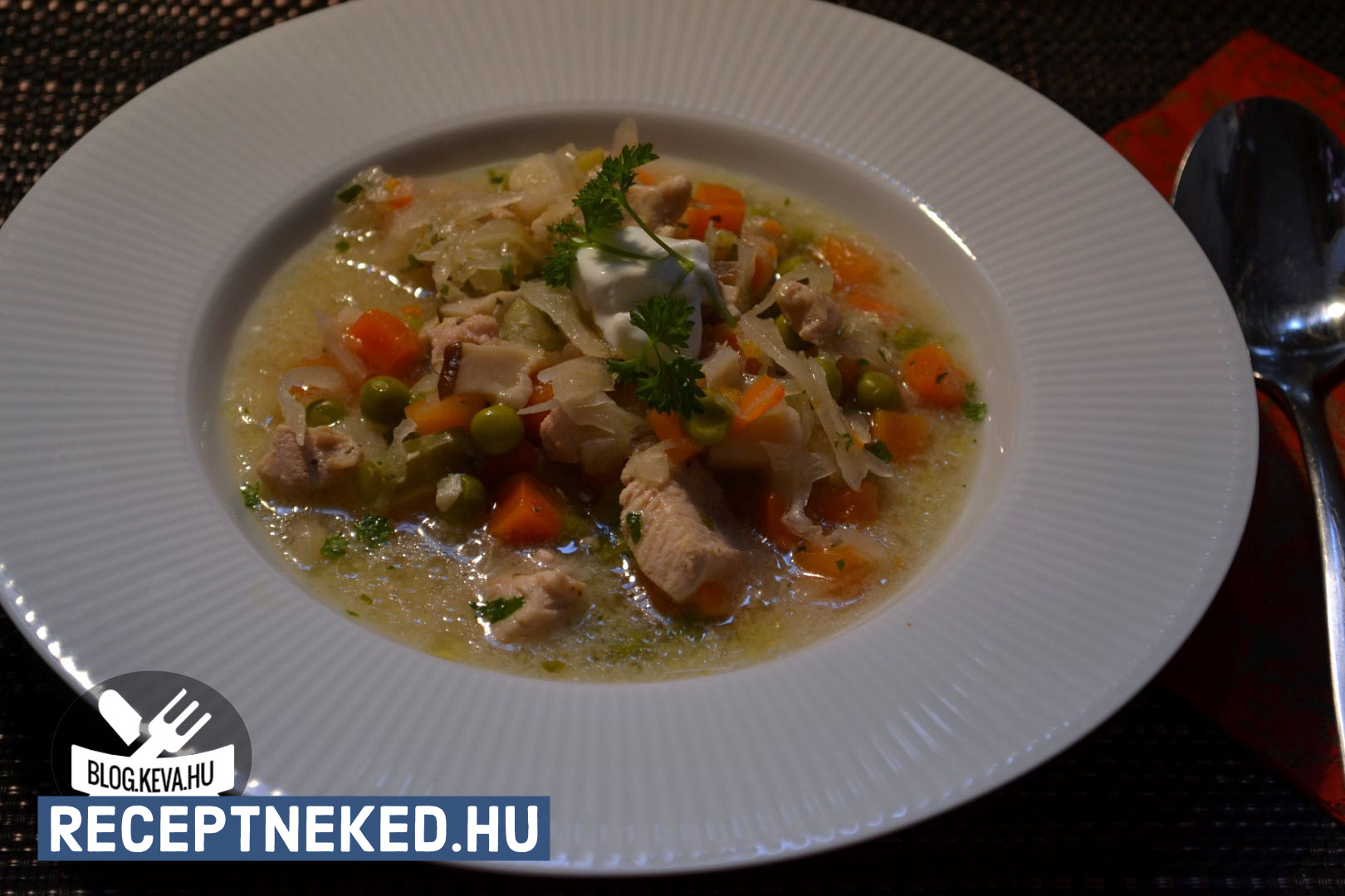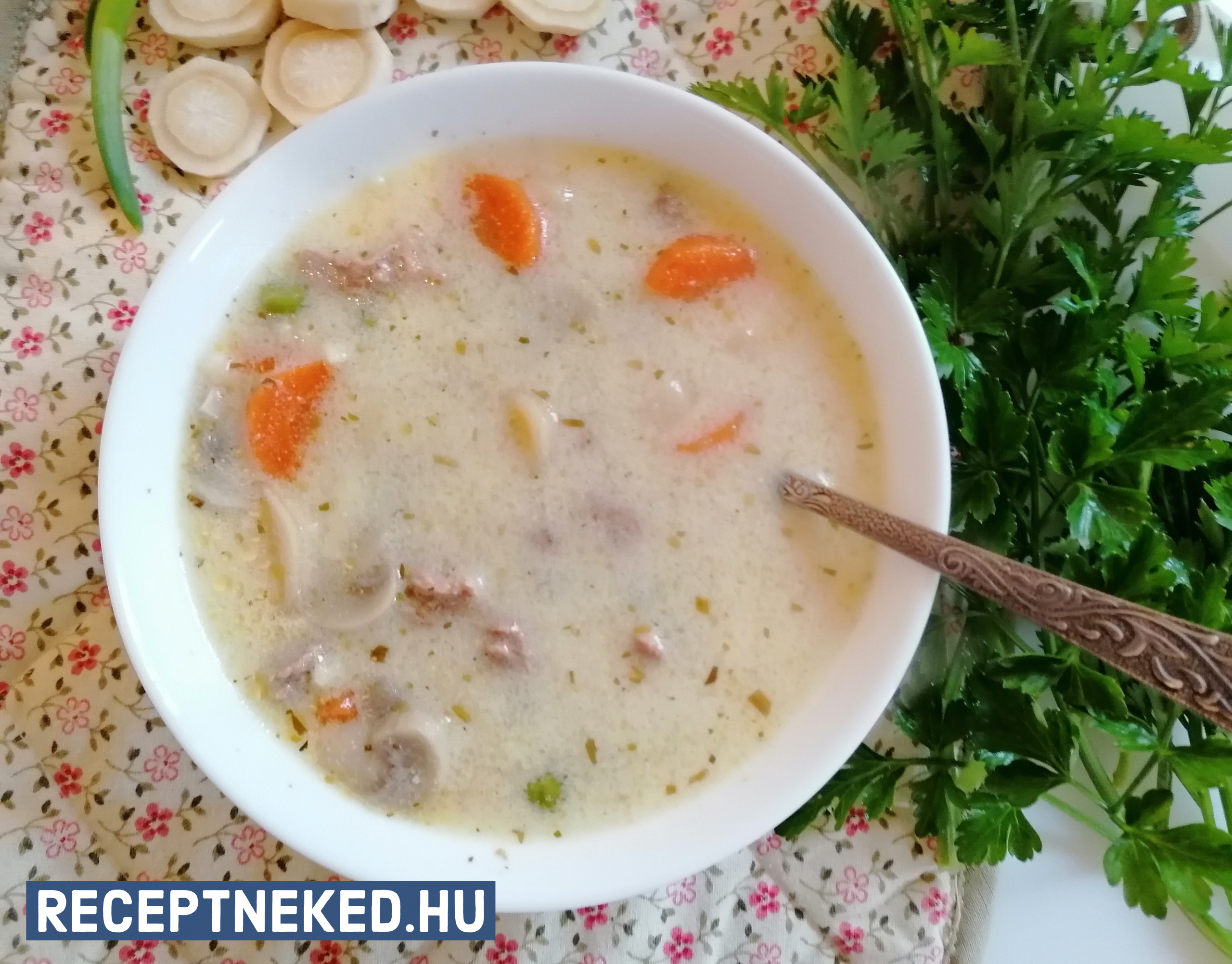 Keverjük hozzá a tejfölös habarást a leveshez, sózzuk, borsozzuk, fűszerezzük, ha még szükséges, majd forraljunk rajta egyet.
