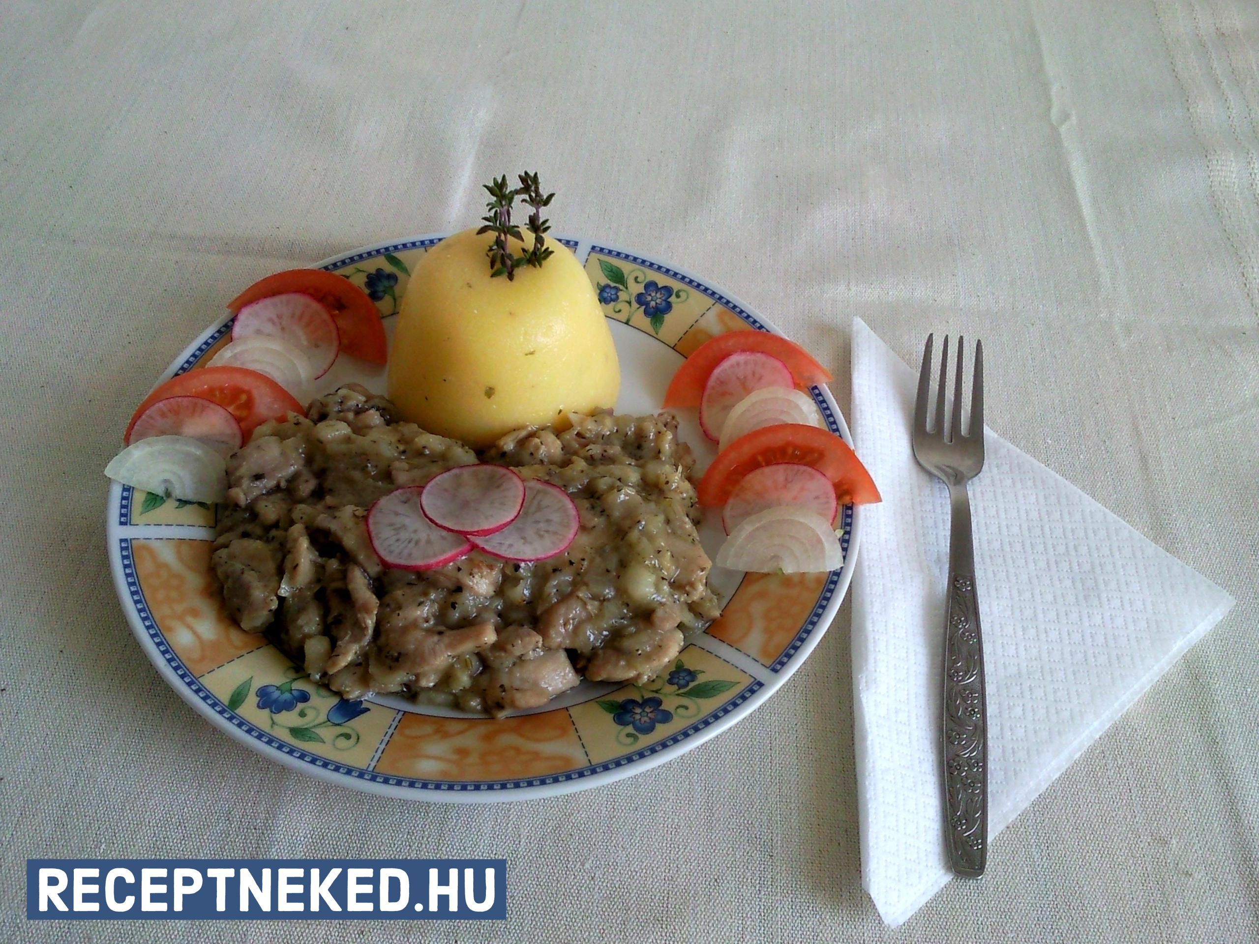 Kevés vízzel felöntjük, majd fedő alatt majdnem készre pároljuk, időnként meg-megkeverjük, ha szükséges a vizet pótoljuk, majd kakukkfűvel megszórjuk, hozzáadjuk a sűrített paradicsomot, és a fehérbort is, készre pároljuk, fedő nélkül, h a felesleges leve elpárologjon.