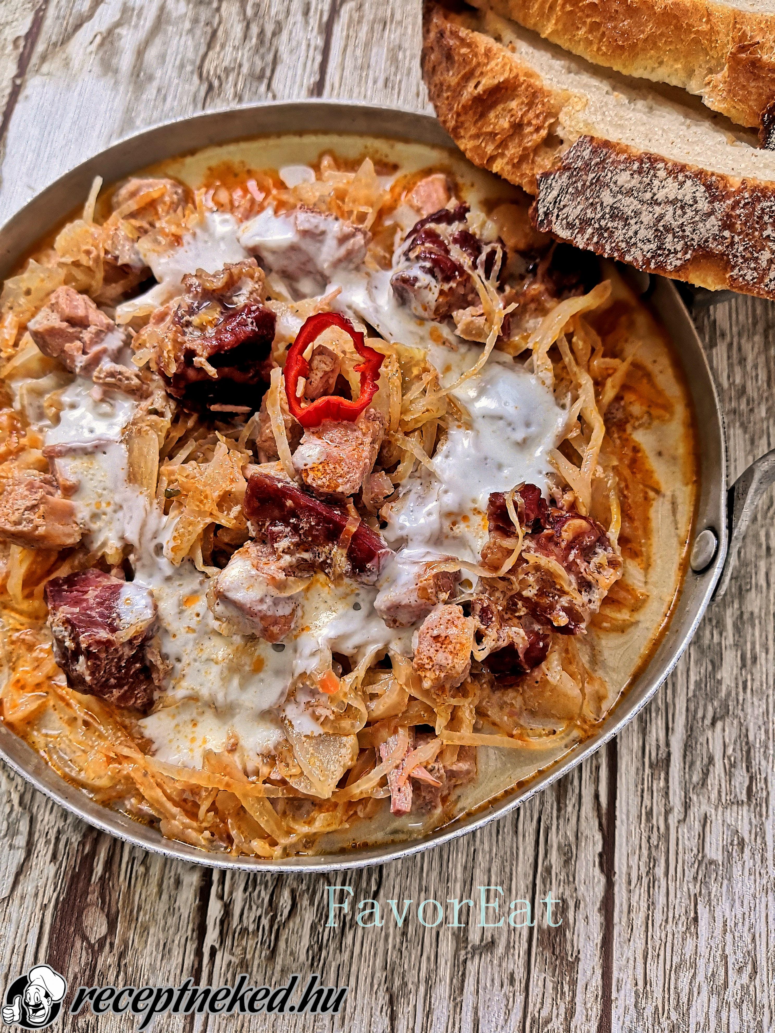Az elkészült ételünket kóstoljuk meg és ha kell még ízesítsük sóval, borssal. Friss kenyérrel és tejföllel meglocsolva forrón tálaljuk.