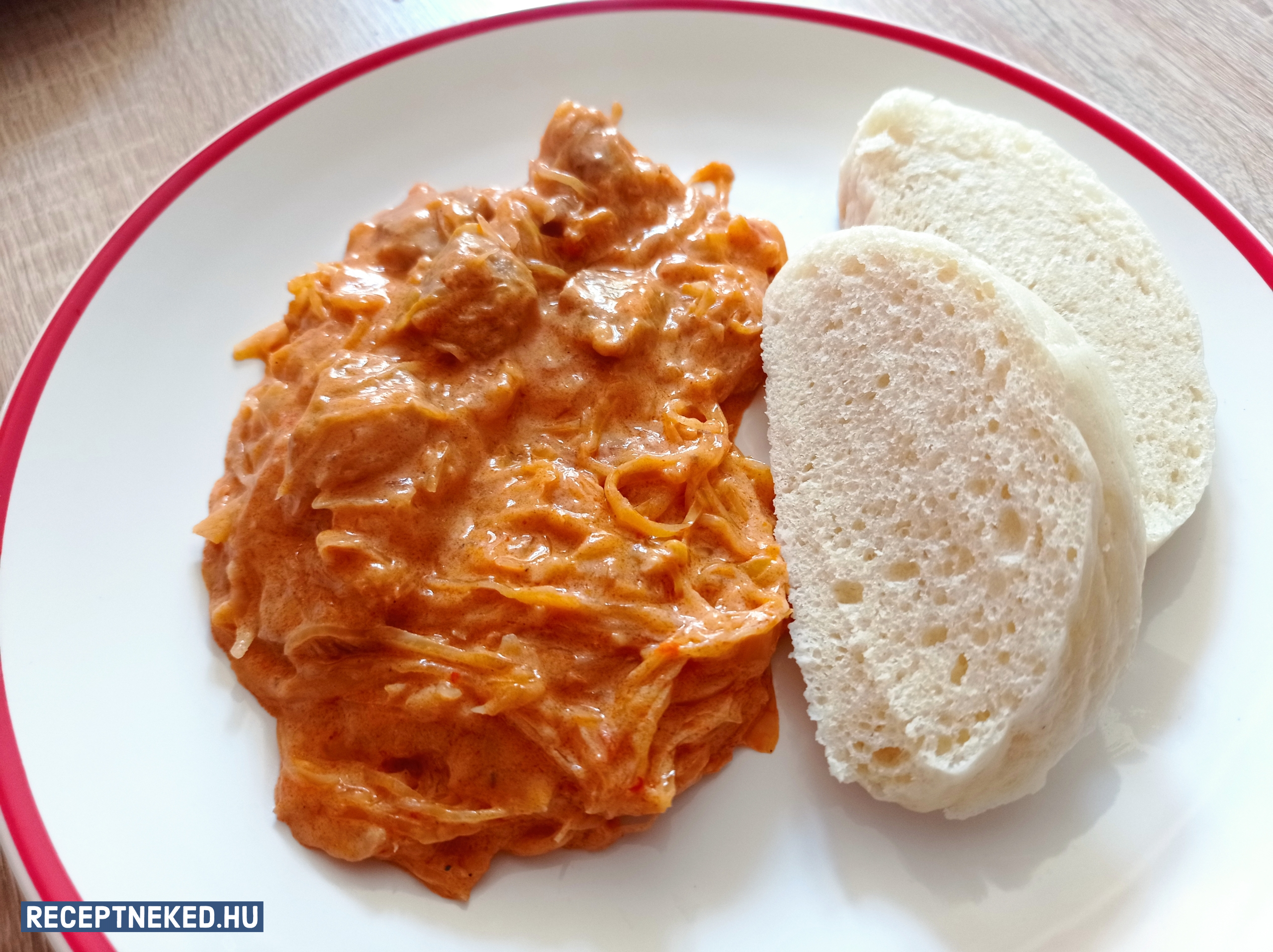 Fedő alatt főzzük a húst és a káposztát puhára. Időnként nézzük meg és ha kell még folyadék, keveset adjunk hozzá.