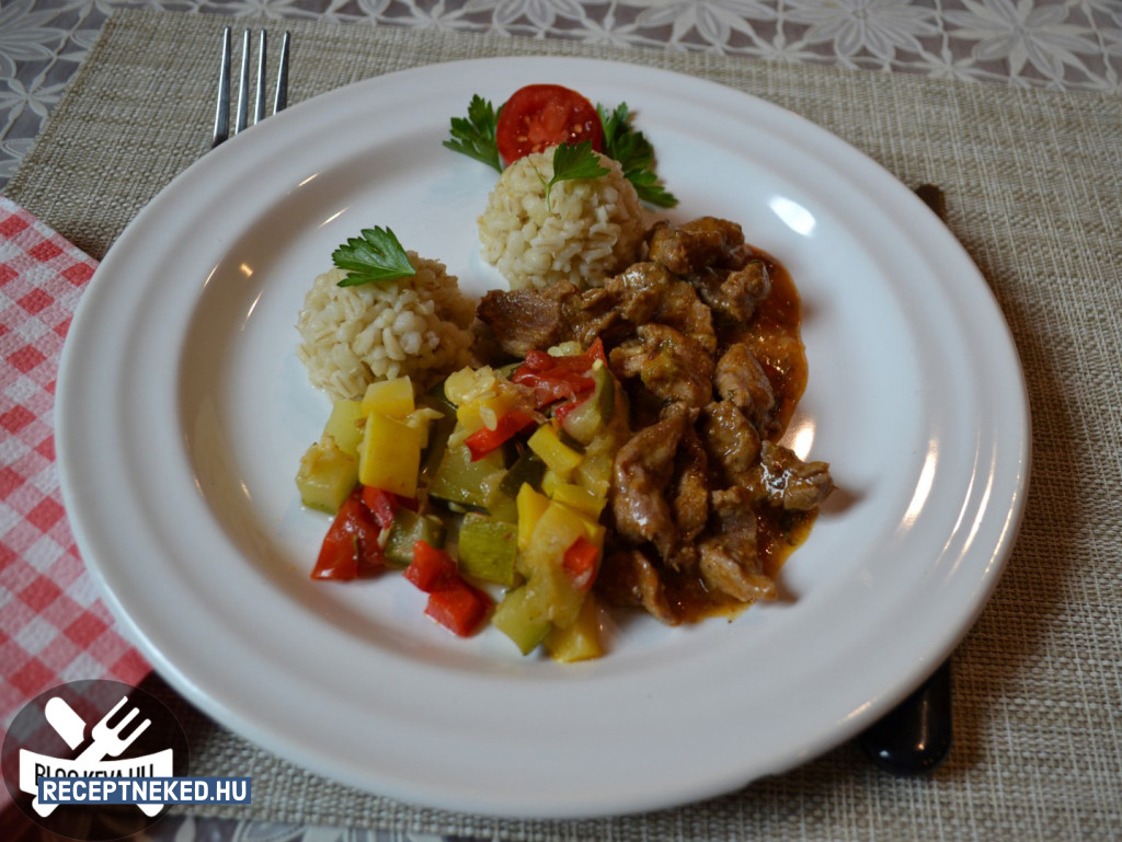 Gyorsan elkeverjük, majd a megtisztított zöldséget átforgatjuk a mustáros keveréken és 1-2 percig pirítjuk. Hozzárakjuk a húst, majd babérlevelet, egész borsszemeket, boróka bogyót felengedjük annyi folyadékkal, ami ellepi a húst.