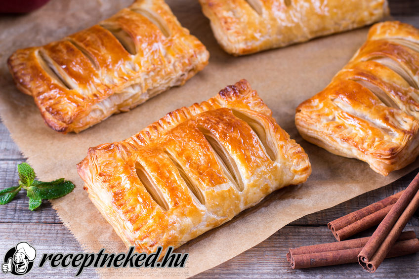 A megkelt tésztát kissé átgyúrjuk és két részre osztjuk. Az egyik tésztát kör alakúra kinyújtjuk (kb 30 cm átmérőjűre), majd 4 cikkre vágjuk. A háromszögekegyforma oldalán, párhuzamosan 3-3 bemetszést ejtünk. A tészta közepére halmozunk 1-2 ek almás tölteléket, majd először az egyik sarkát hajtjuk át a másik oldalra és itt a sarkát lenyomkodjuk, majd a másik sarkát hajtjuk át és kissé összenyomkodjuk. Az alját is összenyomkodjuk, majd sütőpapírral bélelt tepsibe tesszük.