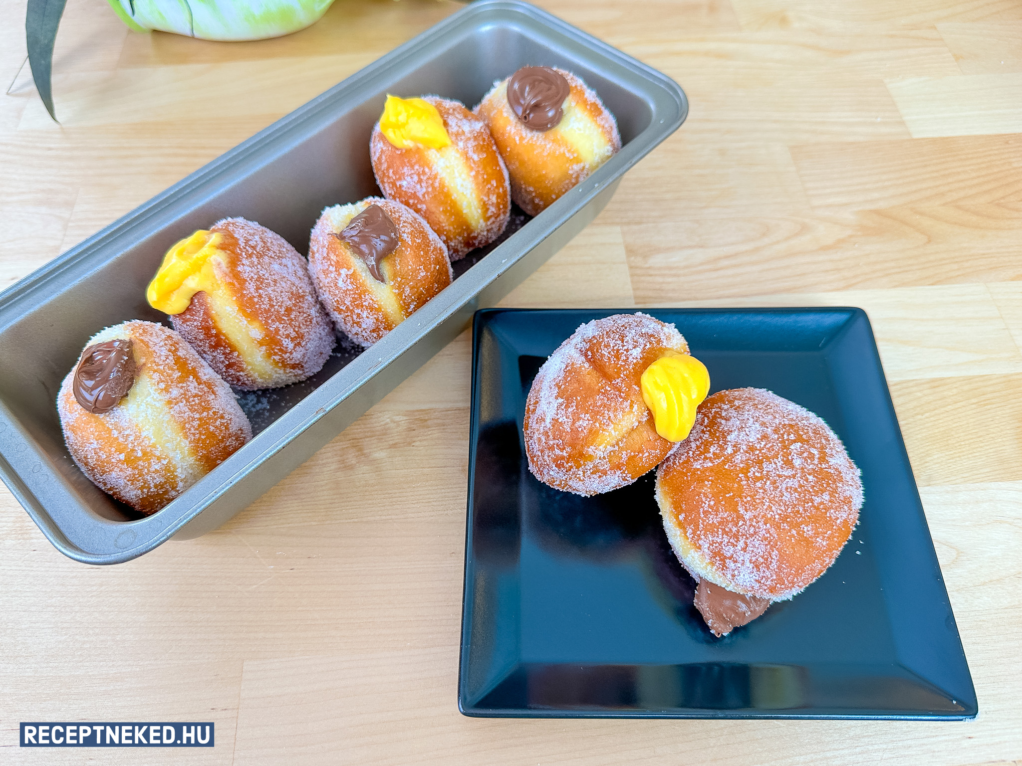 Kés vagy fakanál nyelének segítségével helyet készítünk a tölteléknek és a habzsákból megtöltjük a fánkokat a vaníliás krémmel.