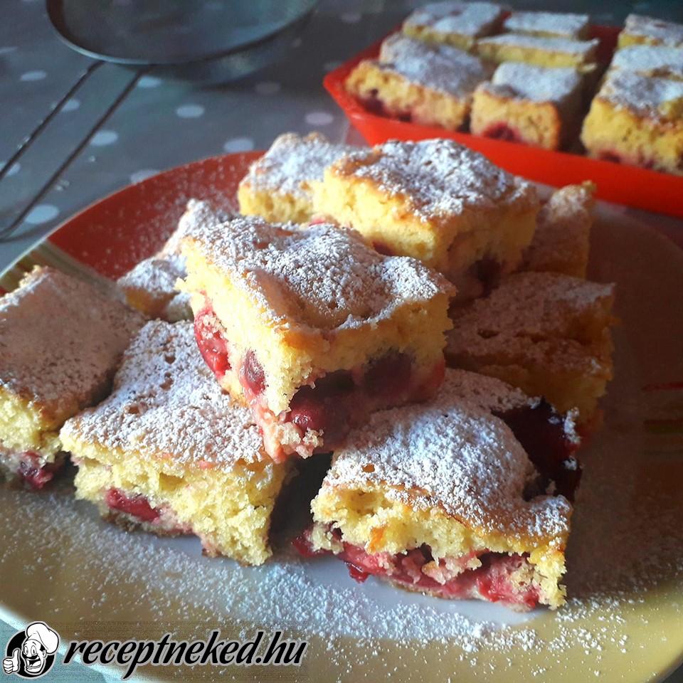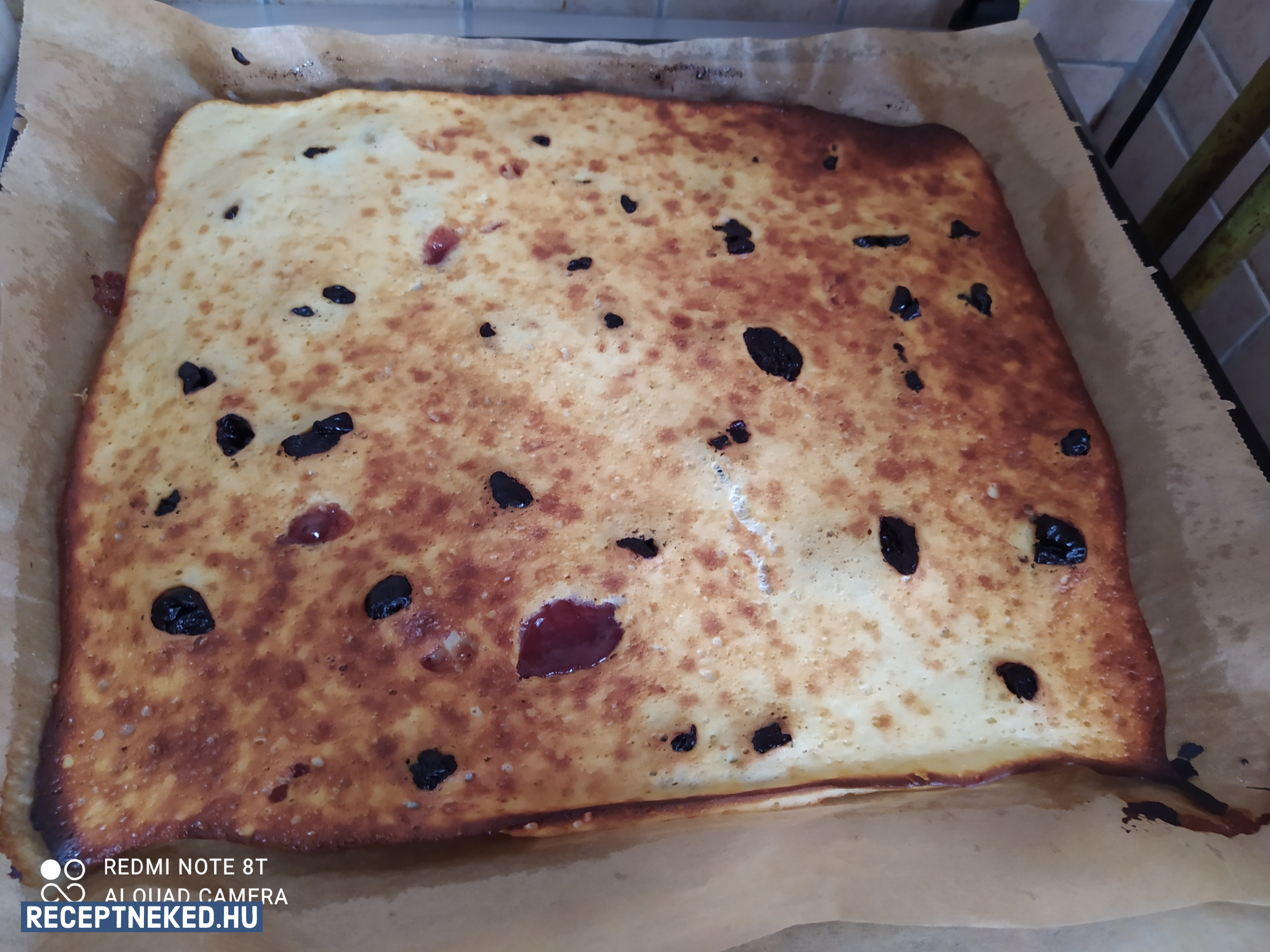 Sütőpapírral bélelt, kb 25*35 cm-es tepsibe öntjük a masszát. Fontos, hogy ne forró sütőbe tegyük a tésztát! Természetesen elő lehet melegíteni, de azt se túlzottan, máskülönben a cukor megég, ami pedig barnás kérget hagy maga után.