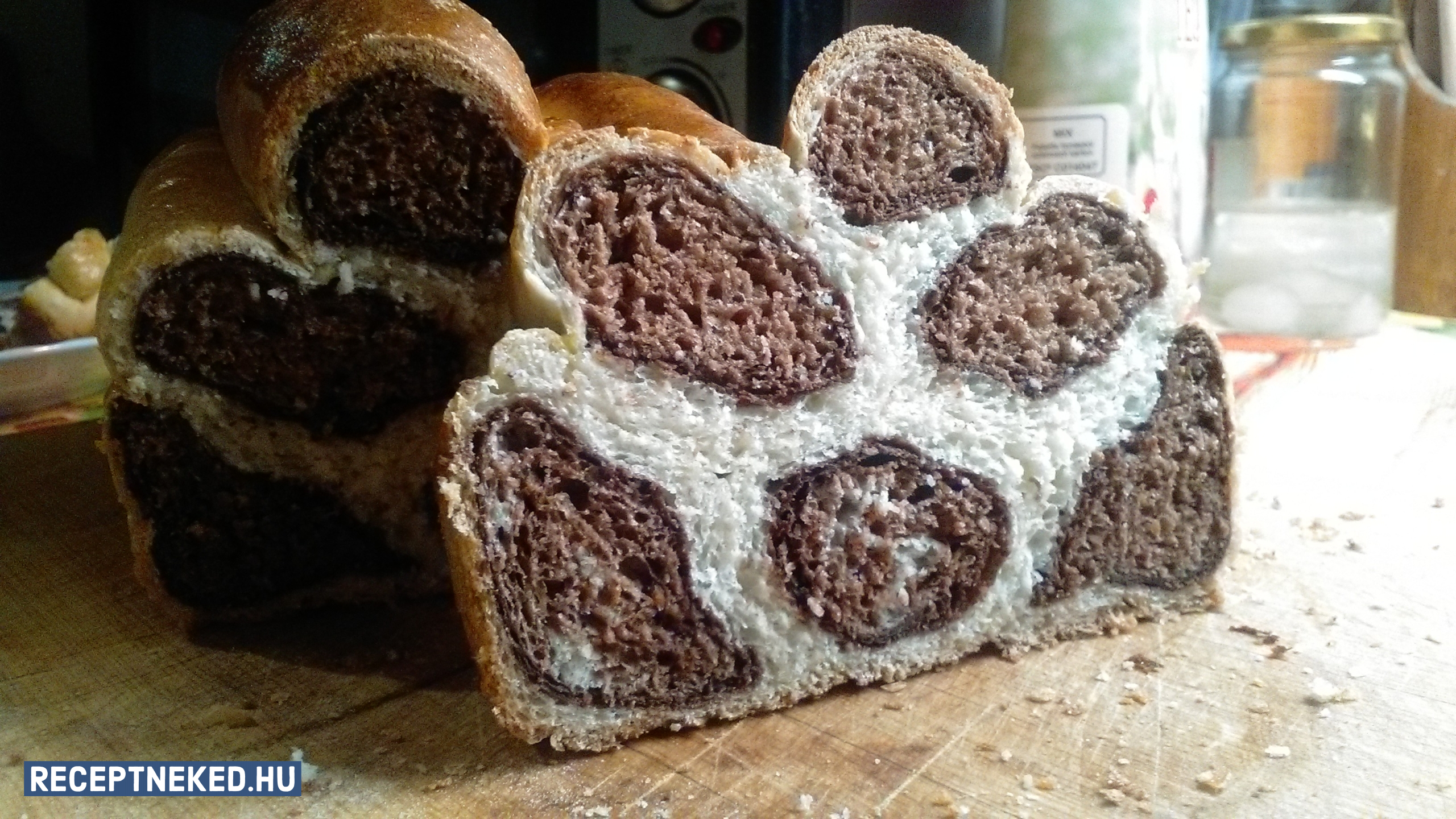 Először a világosabb kakaós gombócokat henger alakúra kisodorjuk (olyan hosszúra, amilyen hosszú a sütőformánk), majd a sötétebb kakaós tésztákat hosszúkás, ovális alakúra kinyújtjuk (olyan hosszúra, amilyen hosszú a sütőformánk), majd a fehér tésztákat is kinyújtjuk hosszúkás, ovális alakúra (ez is olyan hosszú legyen, amilyen hosszú a sütőformánk).