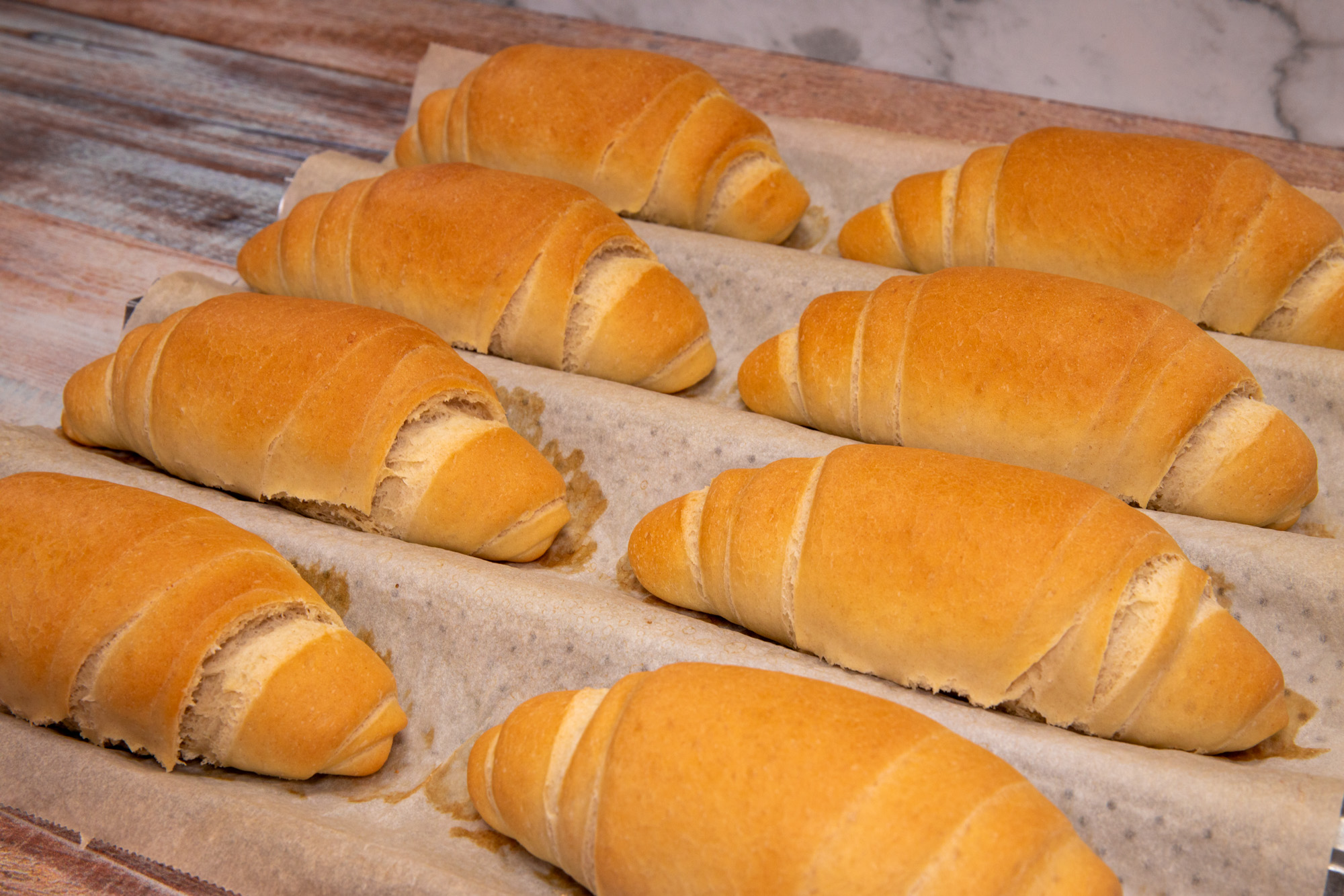 A cipókat egyesével nagyobb körlappá nyújtjuk, majd egy pizzavágó segítségével 4 egyforma cikkre vágjuk. Minden háromszög aljára teszünk a töltelékből, majd a tésztát feltekerjük és kissé meghajlítjuk.