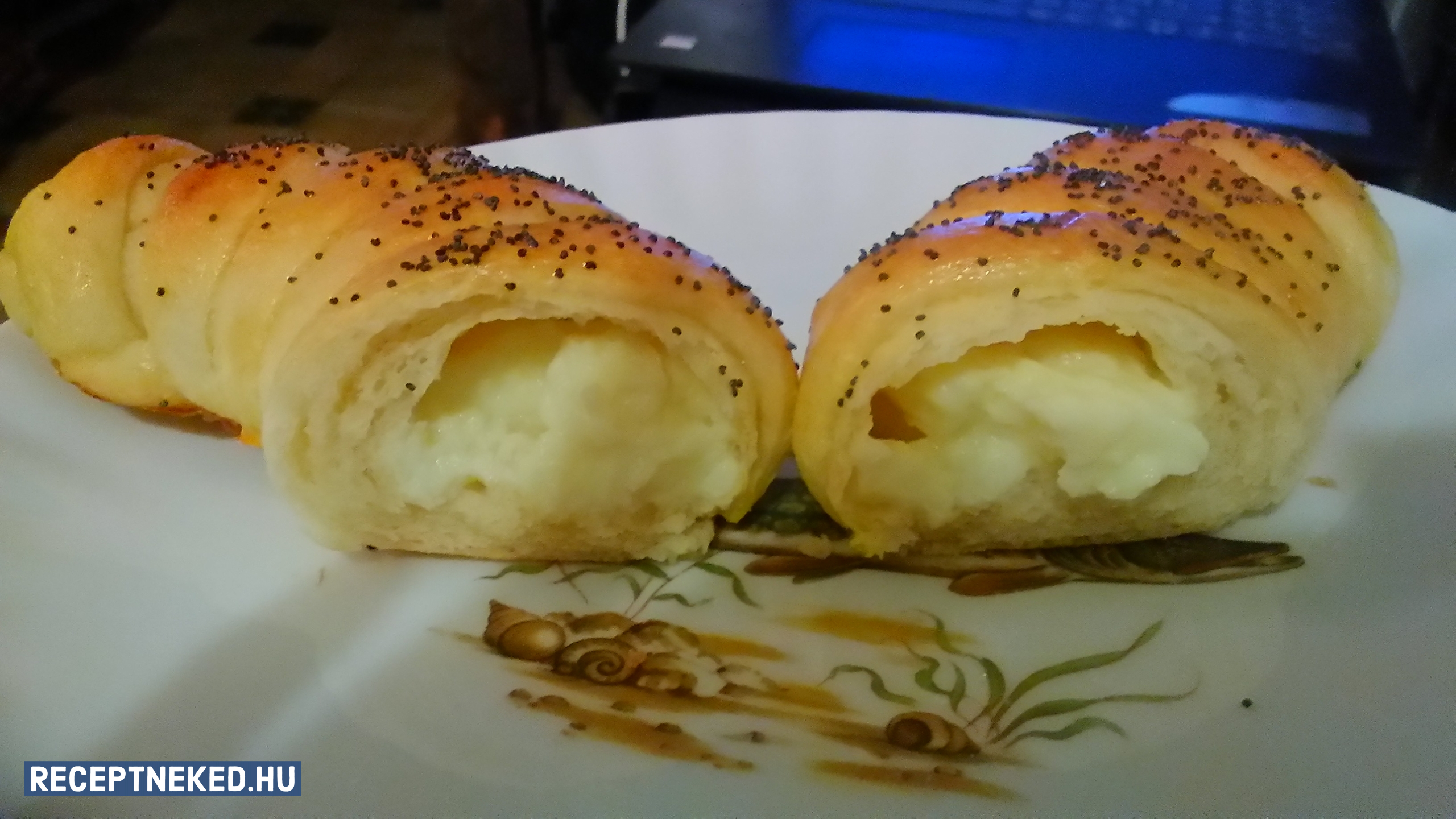 Az egyik végén az egyharmad részét ujjnyi széles csíkokra vágjuk, majd a középső harmadra kenünk a töltelékből. A tészta széleit ráhajtjuk, majd feltekerjük az üresen hagyott rész felől.