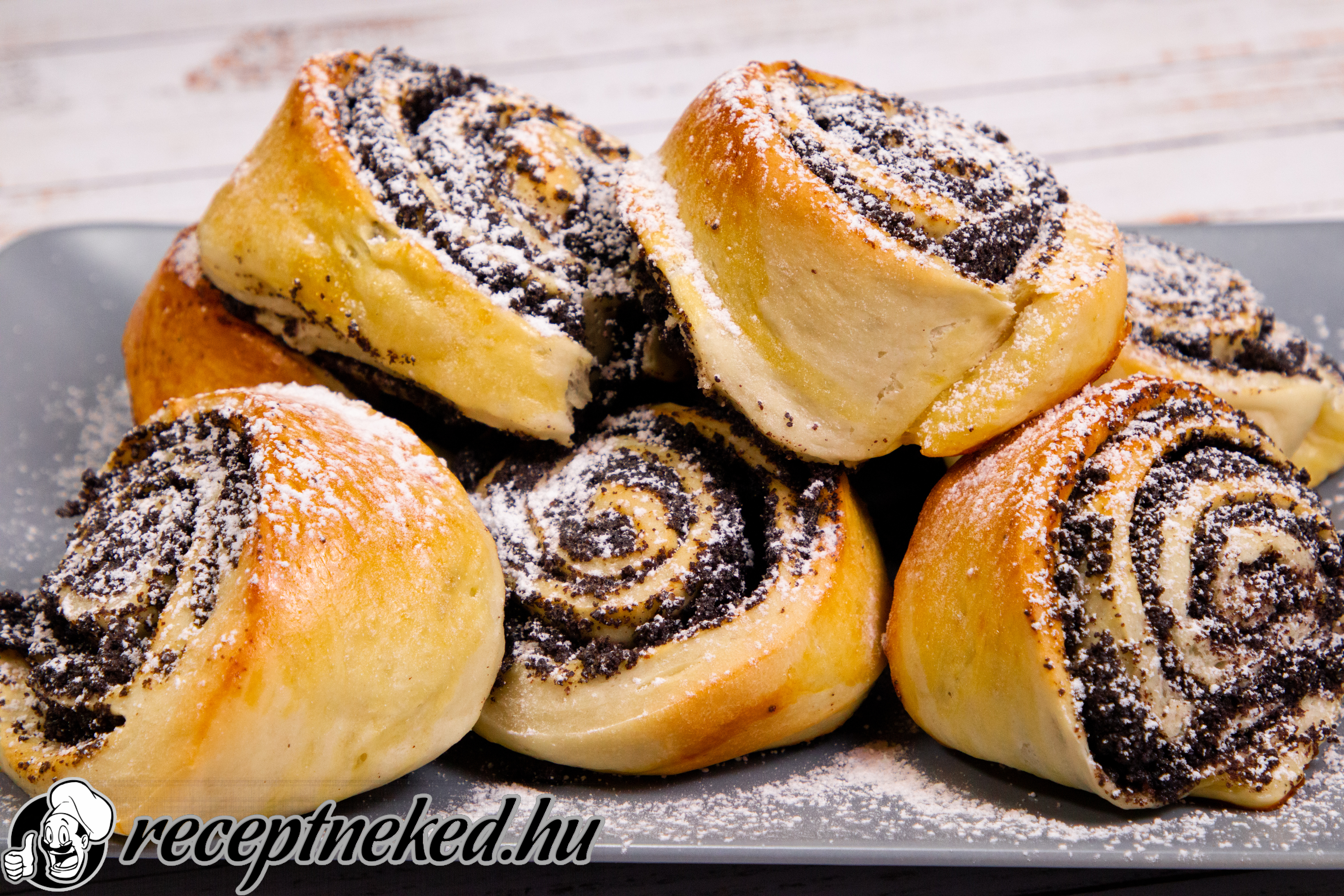 A tésztát kibontjuk és kitekerjük (rajta hagyjuk a sütőpapíron). Állítva magunk elé tesszük és képzeletben 3 egyenlő részre osztjuk függőlegesen. Középen megkenjük pudinggal, majd a pudingra mákot teszünk. Az egyik szélét ráhajtjuk a sütőpapír segítségével, majd újra megkenjük pudinggal és mákot teszünk rá. Ráhajtjuk a másik szélét és kissé összenyomkodjuk. Ezután az egészet megfordítjuk, hogy a hajtás alulra kerüljün. Recés késsel 6 egyenlő részre vágjuk.
