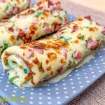 A töltelék hozzávalóiból a sonkát, sajtot és a hagymát apróra összedaraboljuk, majd elkeverjük a tejföllel és ízlés szerint sózzuk, borsozzuk. A sütőt előmelegítjük 180 fokra.