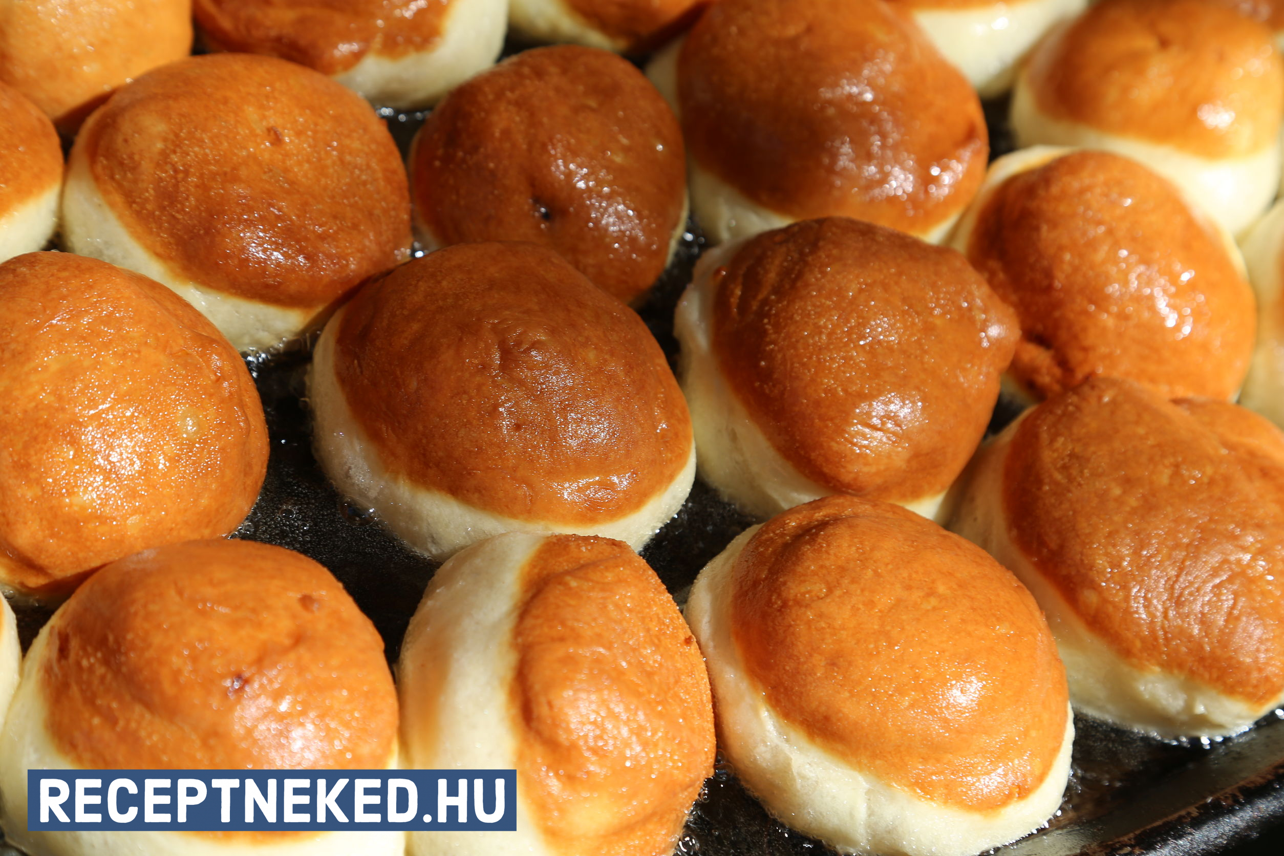 Egy magasabb falú lábasban felmelegítjük az olajat, ha a fánkok megkeltek, ujjainkkal minden fánk közepét kissé benyomjuk, úgy tesszük az olajba, hogy a fánk felső fele kerüljön alulra.