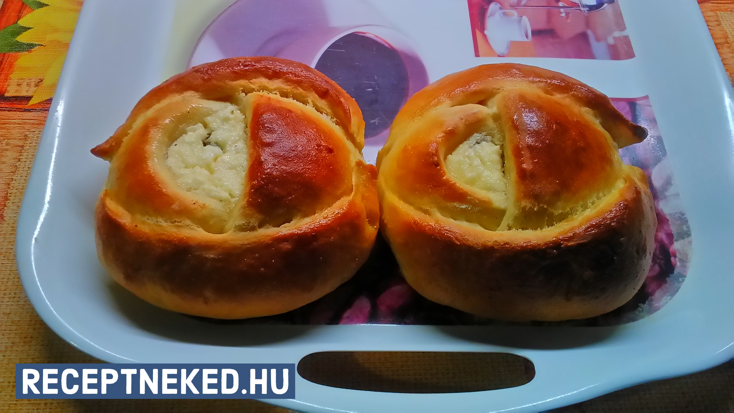 A egy telített kört négy helyen bevágjuk a szélein, a közepébe túró tölteléket teszünk és rózsa formára alakítjuk. Egy muffin formát olajjal kikenjük, a rózsákat bele tesszük és felvert tojással lekenjük.