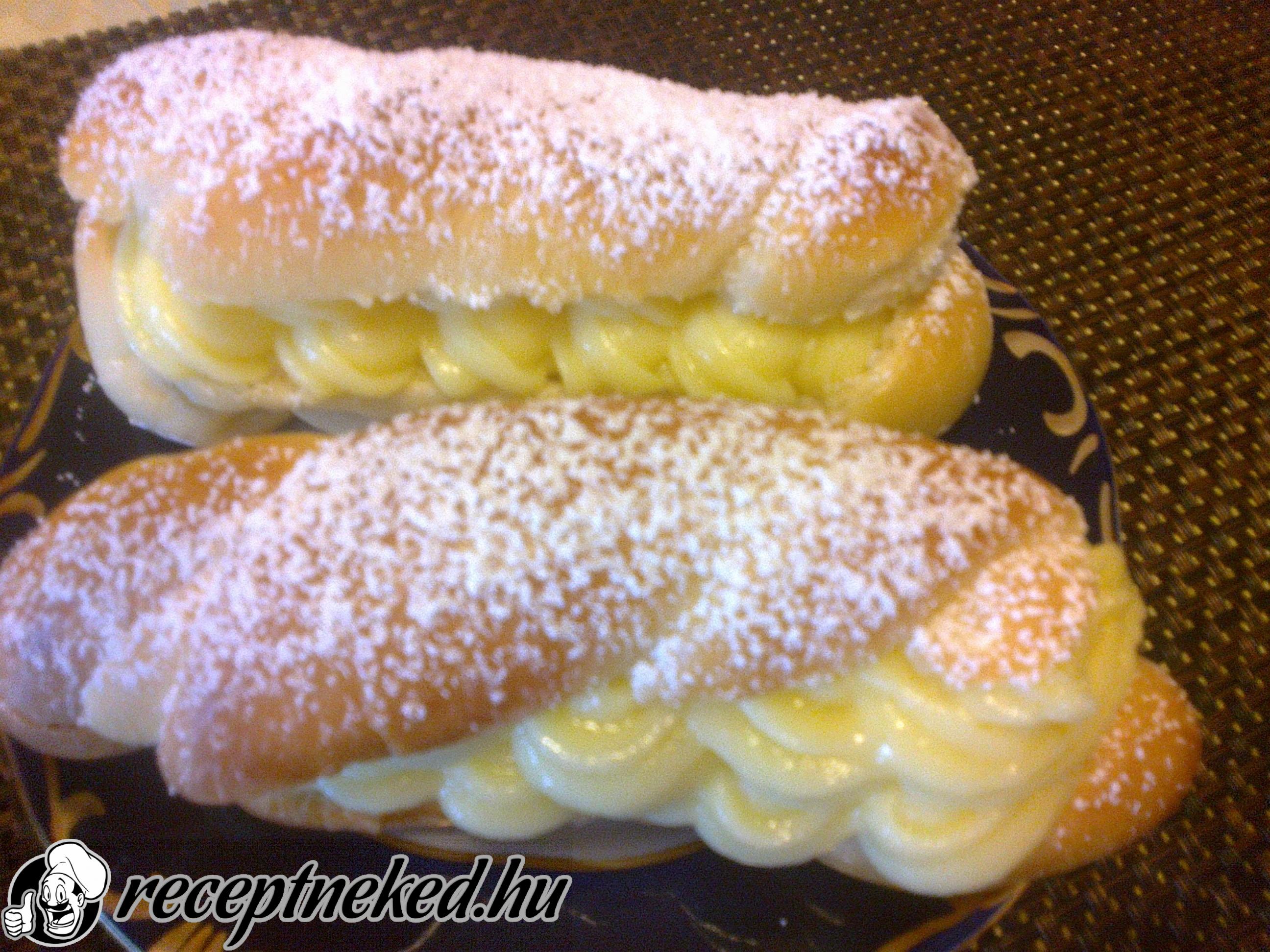 A kihűlt kalácsokat félbe vágjuk, a krémet habzsákba tesszük, és megtöltjük vele a kalácsokat.