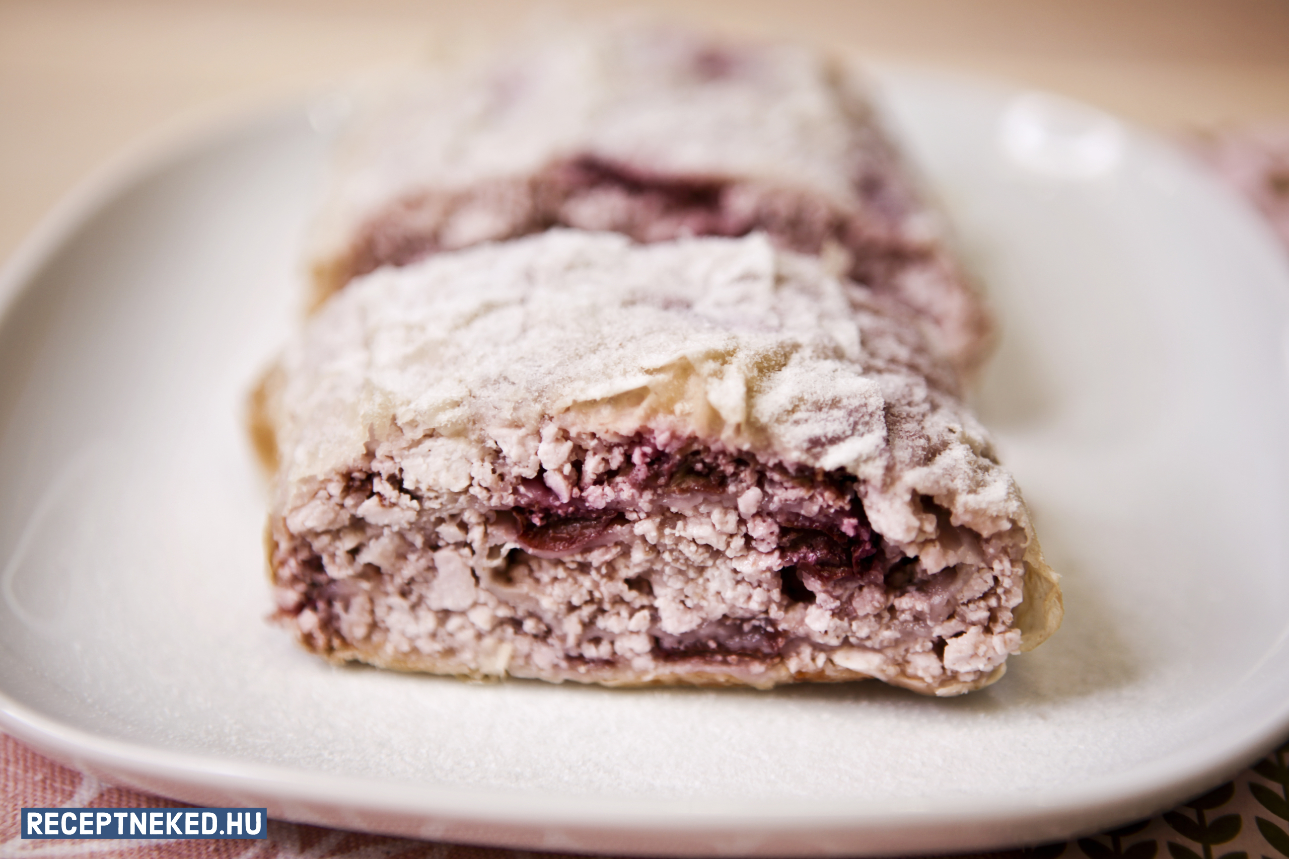 Kivesszük a sütőből, megszórjuk porcukorral, konyharuhával letakarjuk és kicsit megnyomkodjuk. 10 perc után szeletelhető és porcukorral hinthető.