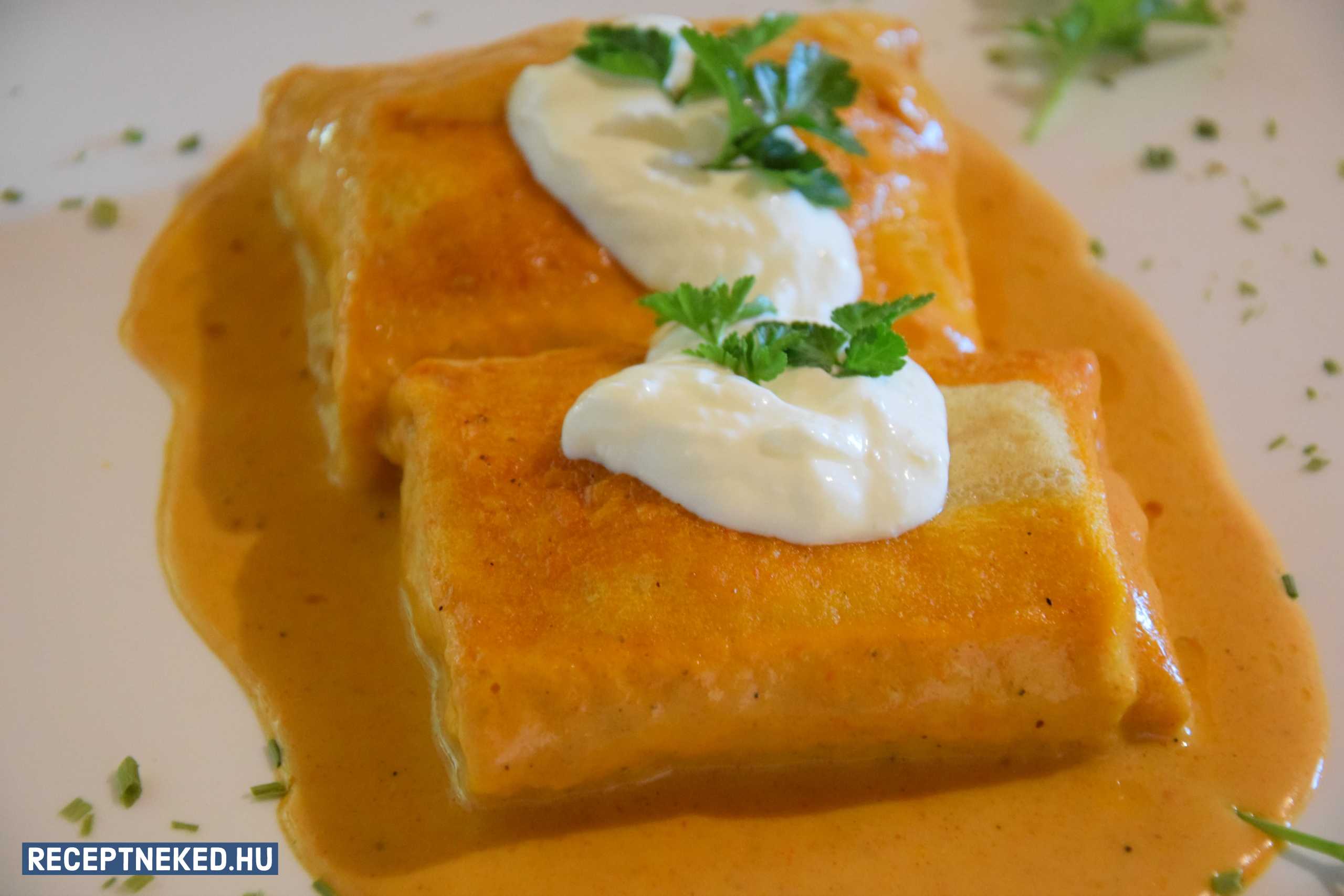 A megtöltött palacsintákat tálra sorakoztatjuk, meglocsoljuk a paprikás-tejfölös mártással és a tetejére tejfölt locsolunk és megszórjuk petrezselyemzölddel.