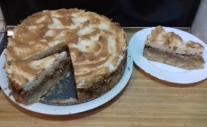 A tortaformába kanalazzuk a meglocsolt kifliket, eligazítjuk, majd megkenjük lekvárral. A lekvár tetejét megszórjuk darált dióval úgy, hogy teljesen befedje. A dió tetejére ráhalmozzuk a megpárolt almát és elsimítjuk. 180 fokos, előmelegített sütőbe toljuk 25 percre.