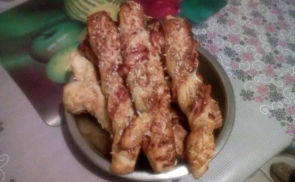 A tésztát kb 5 mm vastagra, téglalap alakúra kinyújtjuk, majd az egyik felére rákenjük egyenletesen a szószt és megszórjuk sajttal, majd a másik felét ráhajtjuk és kissé összenyomkodjuk. Az összehajtott tésztát kb 1 cm vastag csíkokra vágjuk.