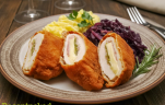 Rántott csirkemell sajttal, baconnal és csípős paprikával töltve