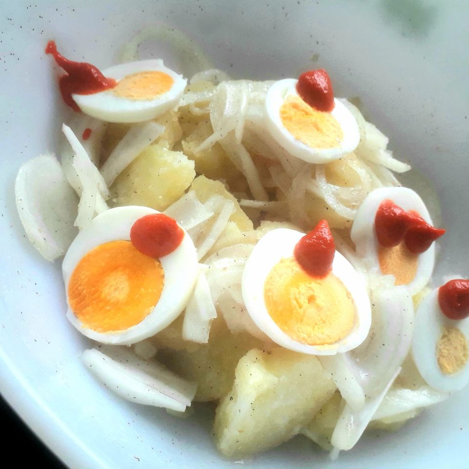 Sokat gondolkodtam, hogy az egyszerű sült csirkéhez milyen köretet kínáljak. Aztán maradtam az egyszerű krumpli salátánál, amit kiegészítettem egy kevés almával és sajttal. Érdemes előző nap este összeállítani, hogy legyen ideje az ízeknek kellőképpen összeérni. Sültekhez, bundás húsokhoz remek kísérő fogás.