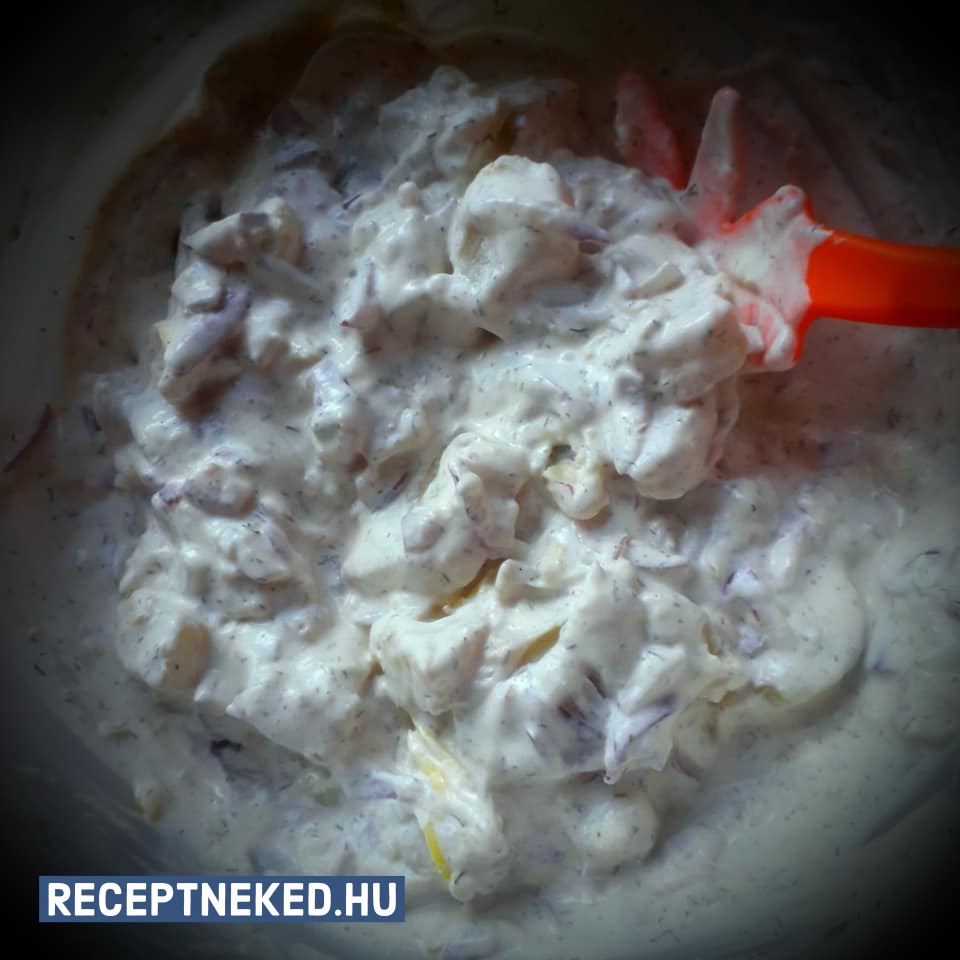Közben a tejfölt simára keverjük a majonézzel, sóval, porcukorral, citromlével.