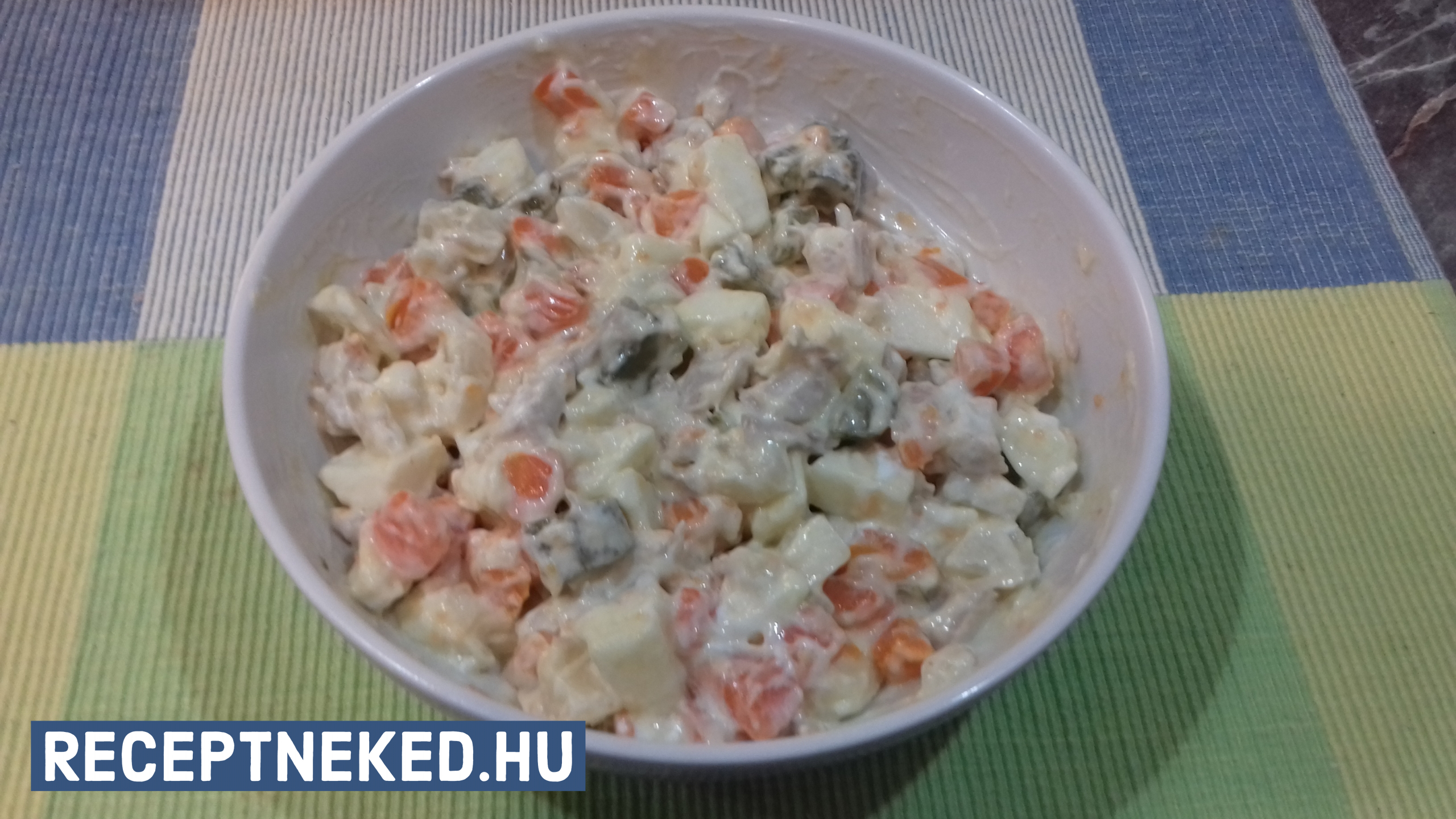 A tejfölt elkeverjük a majonézzel, mustárral, petrezselyemmel és ízlés szerint sózzuk, borsozzuk. Hozzáadjuk az apróra vágott savanyú uborkát, sajtot és a maradék húst. Végül belekeverjük a kukoricát, krumplit és a tojást is.