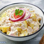 A kihűlt, jól lecsepegtetett burgonyát óvatosan hozzáforgatjuk az öntethez, majd hozzáadjuk a hajszálvékony félkarikákra vágott lilahagymát is. Finoman átkeverjük, hogy ne törjük össze a krumplit.