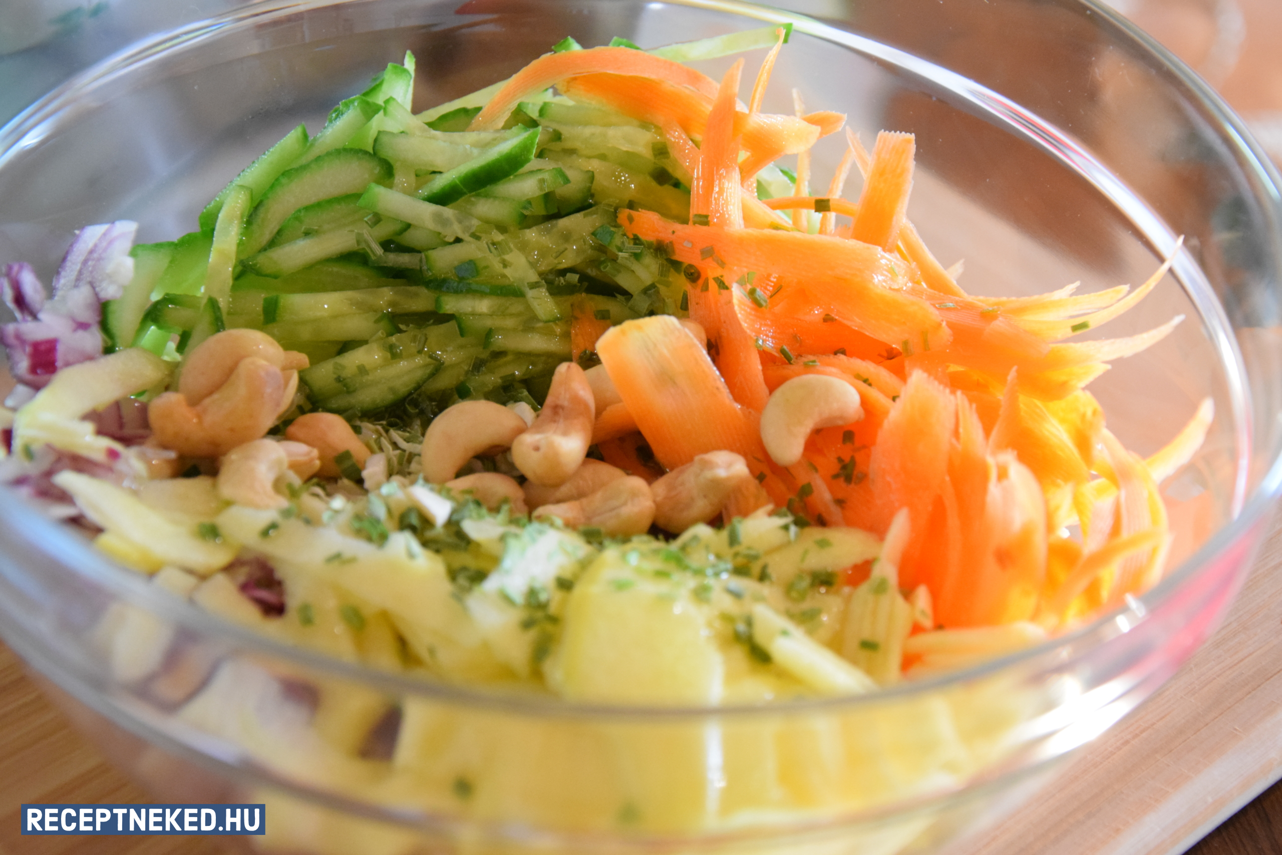 Egy nagyobb tálba tesszük a feldarabolt alapanyagokat, hozzáadjuk a tejfölt, majonézt és ízlés szerint sózzuk, borsozzuk, majd alaposan összeforgatjuk.