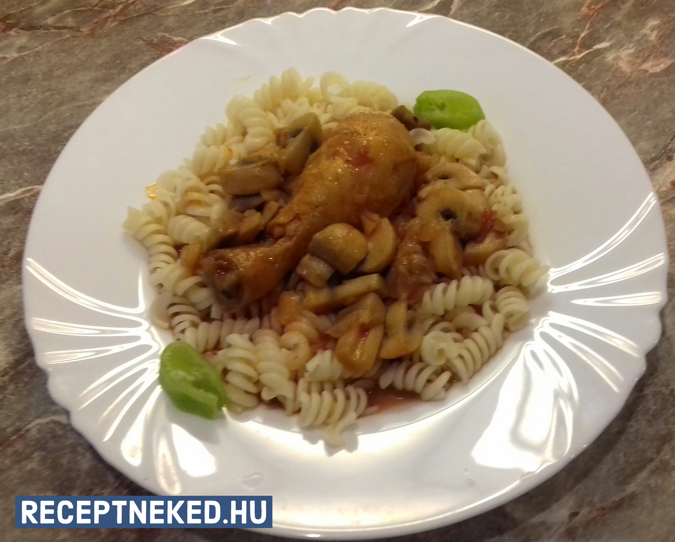 Közben a megtisztított, megmosott gombát, a zöldpaprikát, a paradicsomot cikkekre vágjuk, és a hagymára rakjuk. Hozzáadjuk a fokhagymát, a finomra vágott köménymagot.
