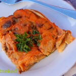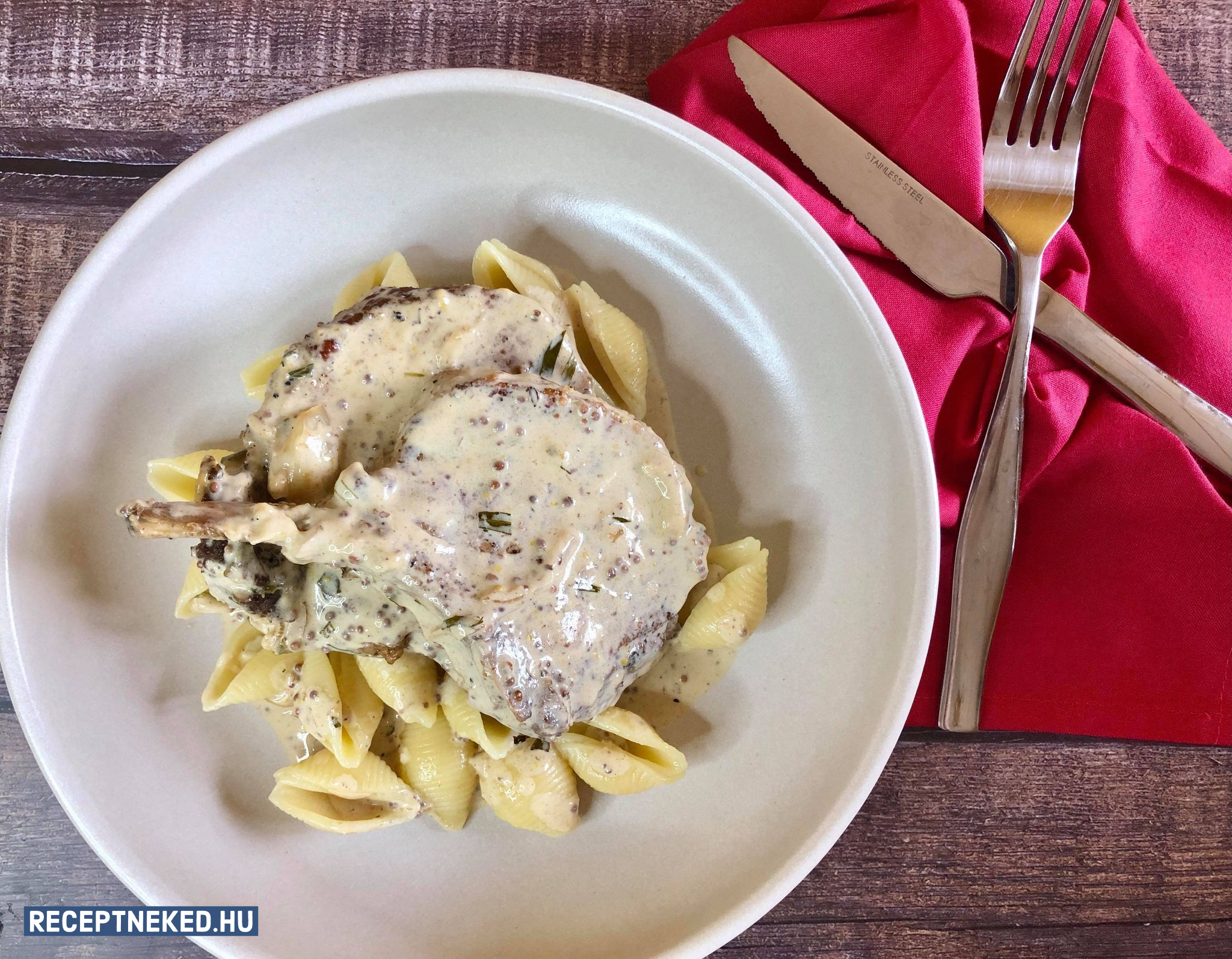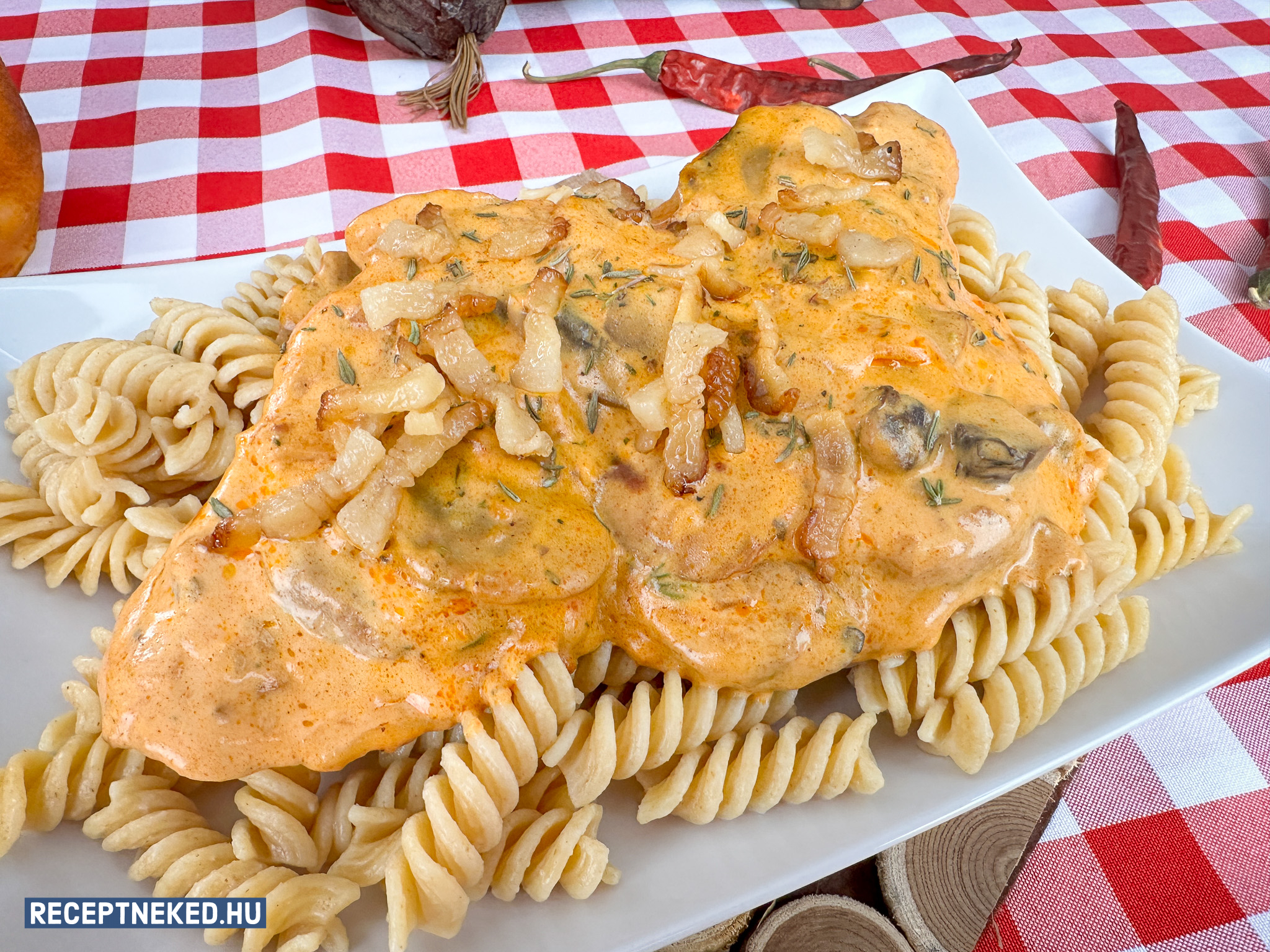 Közben a tejfölt és a tejszínt egy edényben kevés liszttel simára keverjük, a húsra öntjük, jól kiforraljuk.