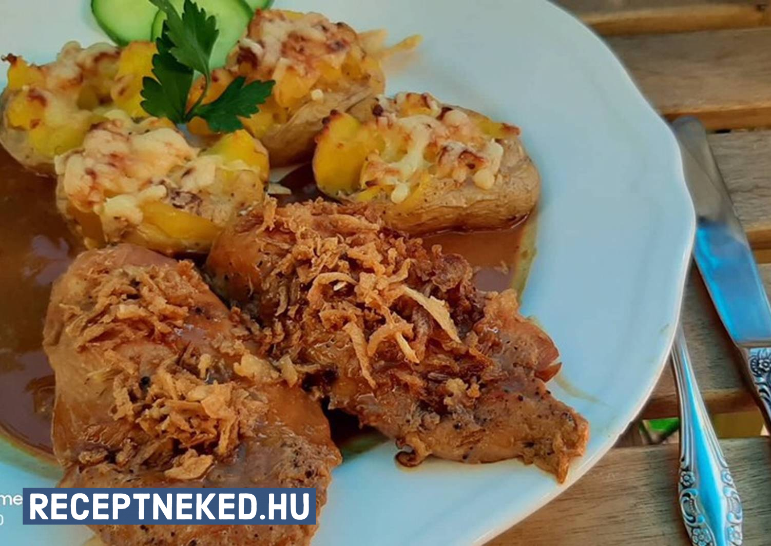 Amikor a hús már kellően puha, vegyük le a fedőt, majd süssük szép pirosra, szaftosra.