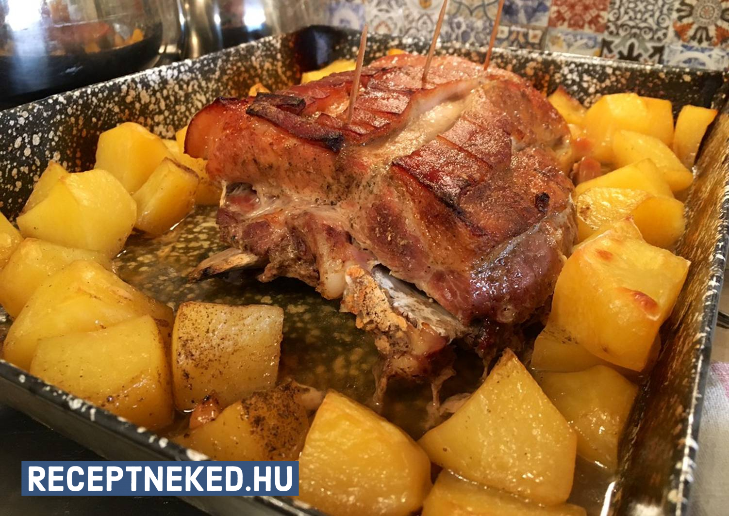 Másnap kizsírozott tepsibe rakjuk, bőrös felével felfelé, a felszeletelt vöröshagymával és a fokhagymagerezdekkel együtt. Kevés vizet öntünk alá, majd kb 170 fokon 1,5 órán keresztül sütjük alufólia alatt.