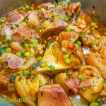 Másnap kizsírozott tepsibe rakjuk, bőrös felével felfelé, a felszeletelt vöröshagymával és a fokhagymagerezdekkel együtt. Kevés vizet öntünk alá, majd kb 170 fokon 1,5 órán keresztül sütjük alufólia alatt.