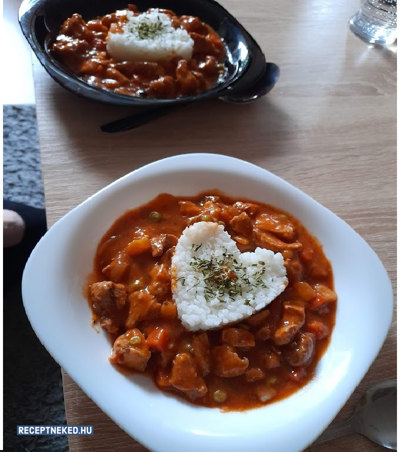 A megtisztított, felkockácott húst megpirítjuk a hagymás olajon, majd miután megpirult minden oldala, a tűzhelyről levéve rászórjuk a pirospaprikát (kb 2 evőkanál, hogy szép piros legyen), majd sózzuk éd borsozzuk.