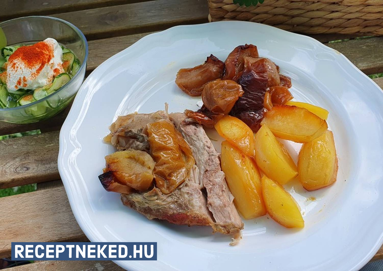 Lefedve, előmelegített sütőben 200 fokon kb. 90 percet puhítjuk, majd a fedőt eltávolítva további 15-20 percet pirítjuk a hőfokot 180-ra csökkentve. Közben párszor meglocsolgatjuk, hogy ne száradjon ki nagyon.Ha már szép piros, akkor kiemeljük a szaftból és hagyjuk teljesen kihűlni.
