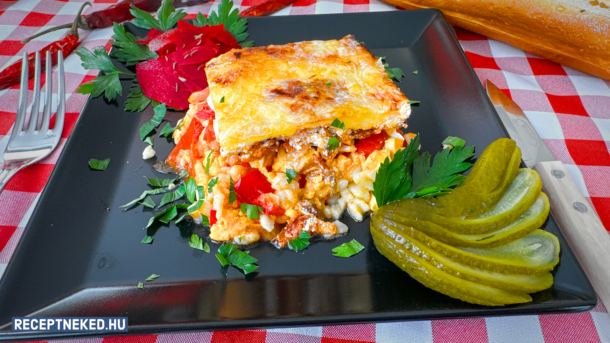 A rétegezést addig folytatjuk, amíg a hozzávalók el nem fogynak. Arra figyeljünk, hogy a tetejére rizs kerüljön, majd tejföl.