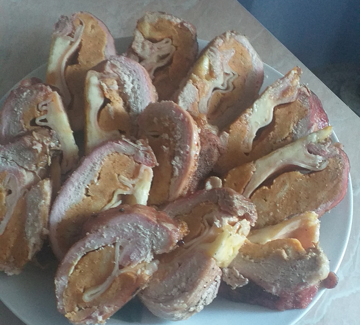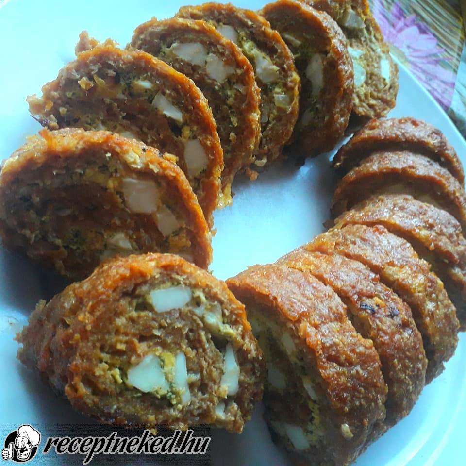 A hozzávalókat jól összegyúrjuk. Egy kisebb tepsi méretű folpackot kiterítünk, erre rásimítjuk a fasírt masszát. Rátesszük a sonkát és a sajtot, majd a folpack segítségével feltekerjük.